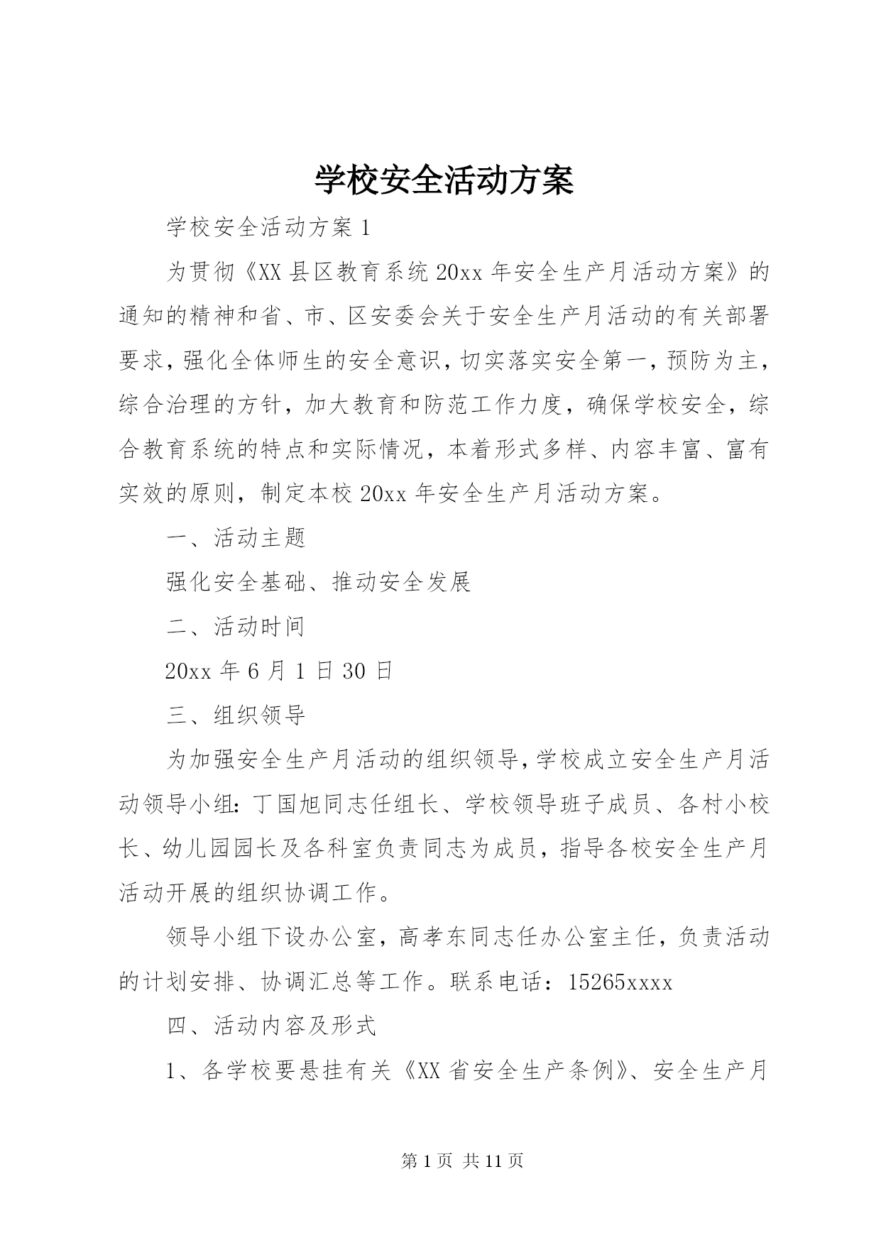第PAGE\*Arabic\*MERGEFORMAT11页共NUMPAGES\*MERGEFORMAT11页学校安全活动方案学校安全活动方案1为贯彻《XX县区教育系统20xx年安全生产月活动方案》的通知的精神和省、市、区安委会关于安全生产月活动的有关部署要求,强化全体师生的安全意识,切实落实安全第一,预防为主,综合治理的方针,加大教育和防范工作力度,确保学校安全,综合教育系统的特点和实际情况,本着形式多样、内容丰富、富有实效的原则,制定本校20xx年安全生产月活动方案。一、活动主题强化安全基础