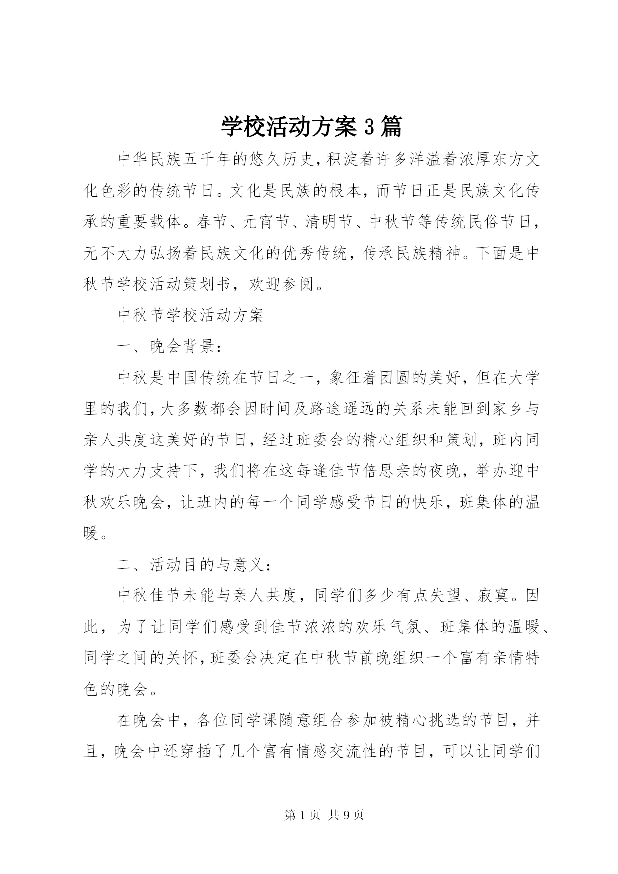 第PAGE\*Arabic\*MERGEFORMAT9页共NUMPAGES\*MERGEFORMAT9页学校活动方案3篇中华民族五千年的悠久历史,积淀着许多洋溢着浓厚东方文化色彩的传统节日。文化是民族的根本,而节日正是民族文化传承的重要载体。春节、元宵节、清明节、中秋节等传统民俗节日,无不大力弘扬着民族文化的优秀传统,传承民族精神。下面是中秋节学校活动策划书,欢迎参阅。中秋节学校活动方案一、晚会背景:中秋是中国传统在节日之一,象征着团圆的美好,但在大学里的我们,大多数都会因时间及路途遥远的关系