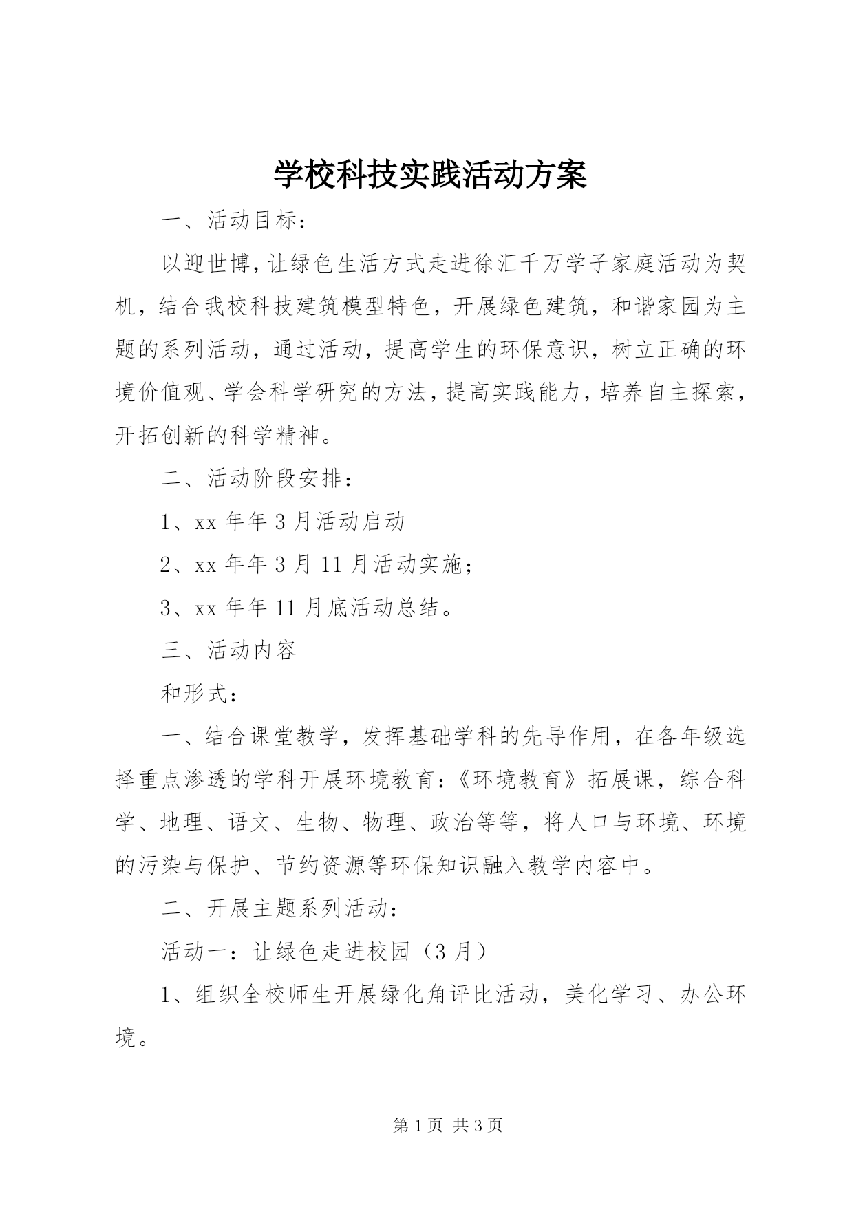 第PAGE\*Arabic\*MERGEFORMAT3页共NUMPAGES\*MERGEFORMAT3页学校科技实践活动方案一、活动目标:以迎世博,让绿色生活方式走进徐汇千万学子家庭活动为契机,结合我校科技建筑模型特色,开展绿色建筑,和谐家园为主题的系列活动,通过活动,提高学生的环保意识,树立正确的环境价值观、学会科学研究的方法,提高实践能力,培养自主探索,开拓创新的科学精神。二、活动阶段安排:1、xx年年3月活动启动2、xx年年3月11月活动实施;3、xx年年11月底活动总结。三、活动内容和