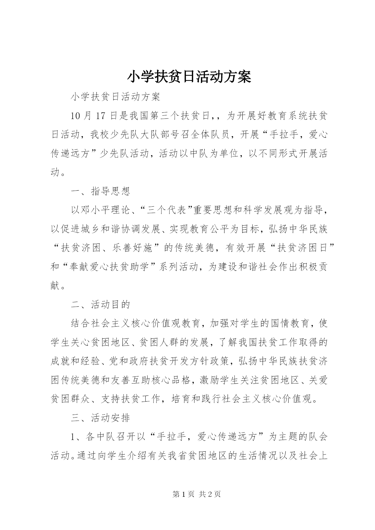 第PAGE\*Arabic\*MERGEFORMAT2页共NUMPAGES\*MERGEFORMAT2页小学扶贫日活动方案小学扶贫日活动方案10月17日是我国第三个扶贫日,,为开展好教育系统扶贫日活动,我校少先队大队部号召全体队员,开展“手拉手,爱心传递远方”少先队活动,活动以中队为单位,以不同形式开展活动。一、指导思想以邓小平理论、“三个代表”重要思想和科学发展观为指导,以促进城乡和谐协调发展、实现教育公平为目标,弘扬中华民族“扶贫济困、乐善好施”的传统美德,有效开展“扶贫济困日”和“奉献爱