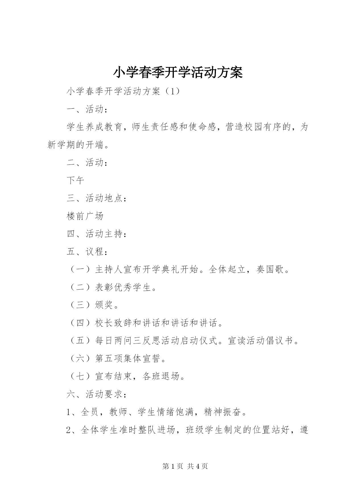 第PAGE\*Arabic\*MERGEFORMAT4页共NUMPAGES\*MERGEFORMAT4页小学春季开学活动方案小学春季开学活动方案(1)一、活动:学生养成教育,师生责任感和使命感,营造校园有序的,为新学期的开端。二、活动:下午三、活动地点:楼前广场四、活动主持:五、议程:(一)主持人宣布开学典礼开始。全体起立,奏国歌。(二)表彰优秀学生。(三)颁奖。(四)校长致辞和讲话和讲话和讲话。(五)每日两问三反思活动启动仪式。宣读活动倡议书。(六)第五项集体宣誓。(七)宣布结束,各班退场。