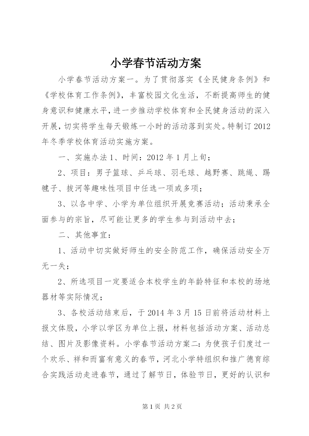 第PAGE\*Arabic\*MERGEFORMAT2页共NUMPAGES\*MERGEFORMAT2页小学春节活动方案小学春节活动方案一。为了贯彻落实《全民健身条例》和《学校体育工作条例》,丰富校园文化生活,不断提高师生的健身意识和健康水平,进一步推动学校体育和全民健身活动的深入开展,切实将学生每天锻炼一小时的活动落到实处。特制订2012年冬季学校体育活动实施方案。一、实施办法1、时间:2012年1月上旬;2、项目:男子篮球、乒乓球、羽毛球、越野赛、跳绳、踢毽子、拔河等趣味性项目中任选一项或