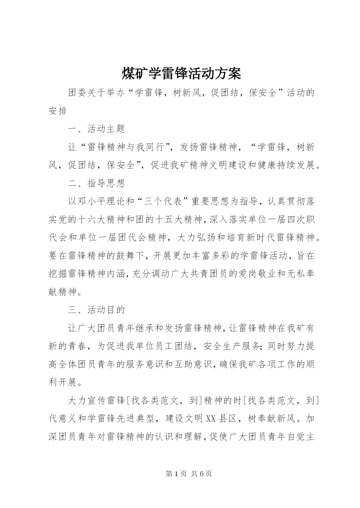 第PAGE\*Arabic\*MERGEFORMAT6页共NUMPAGES\*MERGEFORMAT6页煤矿学雷锋活动方案团委关于举办“学雷锋,树新风,促团结,保安全”活动的安排一、活动主题让“雷锋精神与我同行”,发扬雷锋精神,“学雷锋,树新风,促团结,保安全”,促进我矿精神文明建设和健康持续发展。二、指导思想以邓小平理论和“三个代表”重要思想为指导,认真贯彻落实党的十六大精神和团的十五大精神,深入落实单位一届四次职代会和单位一届团代会精神,大力弘扬和培育新时代雷锋精神。要在雷锋精神的鼓舞下,