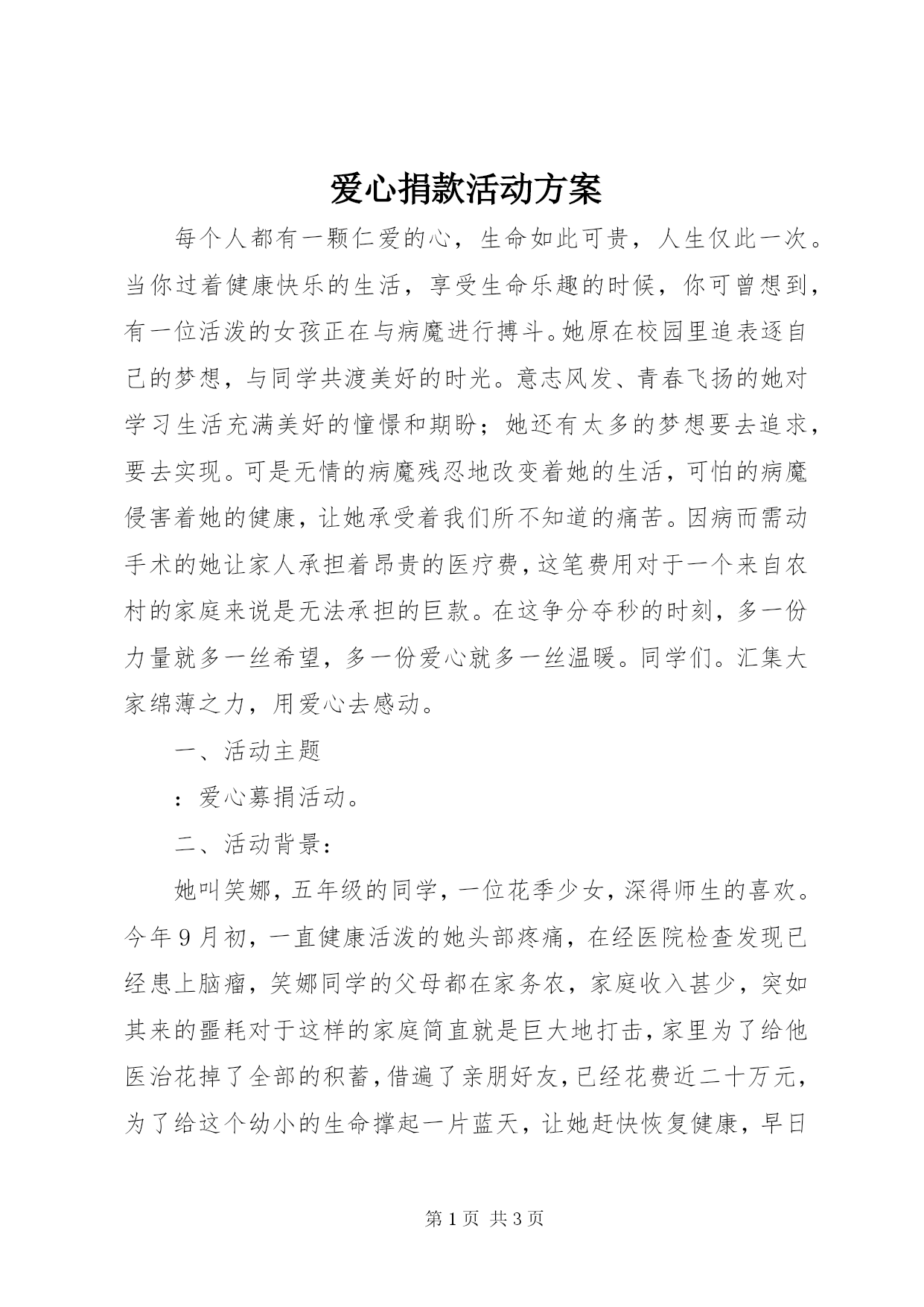 第PAGE\*Arabic\*MERGEFORMAT3页共NUMPAGES\*MERGEFORMAT3页爱心捐款活动方案每个人都有一颗仁爱的心,生命如此可贵,人生仅此一次。当你过着健康快乐的生活,享受生命乐趣的时候,你可曾想到,有一位活泼的女孩正在与病魔进行搏斗。她原在校园里追表逐自己的梦想,与同学共渡美好的时光。意志风发、青春飞扬的她对学习生活充满美好的憧憬和期盼;她还有太多的梦想要去追求,要去实现。可是无情的病魔残忍地改变着她的生活,可怕的病魔侵害着她的健康,让她承受着我们所不知道的痛苦。