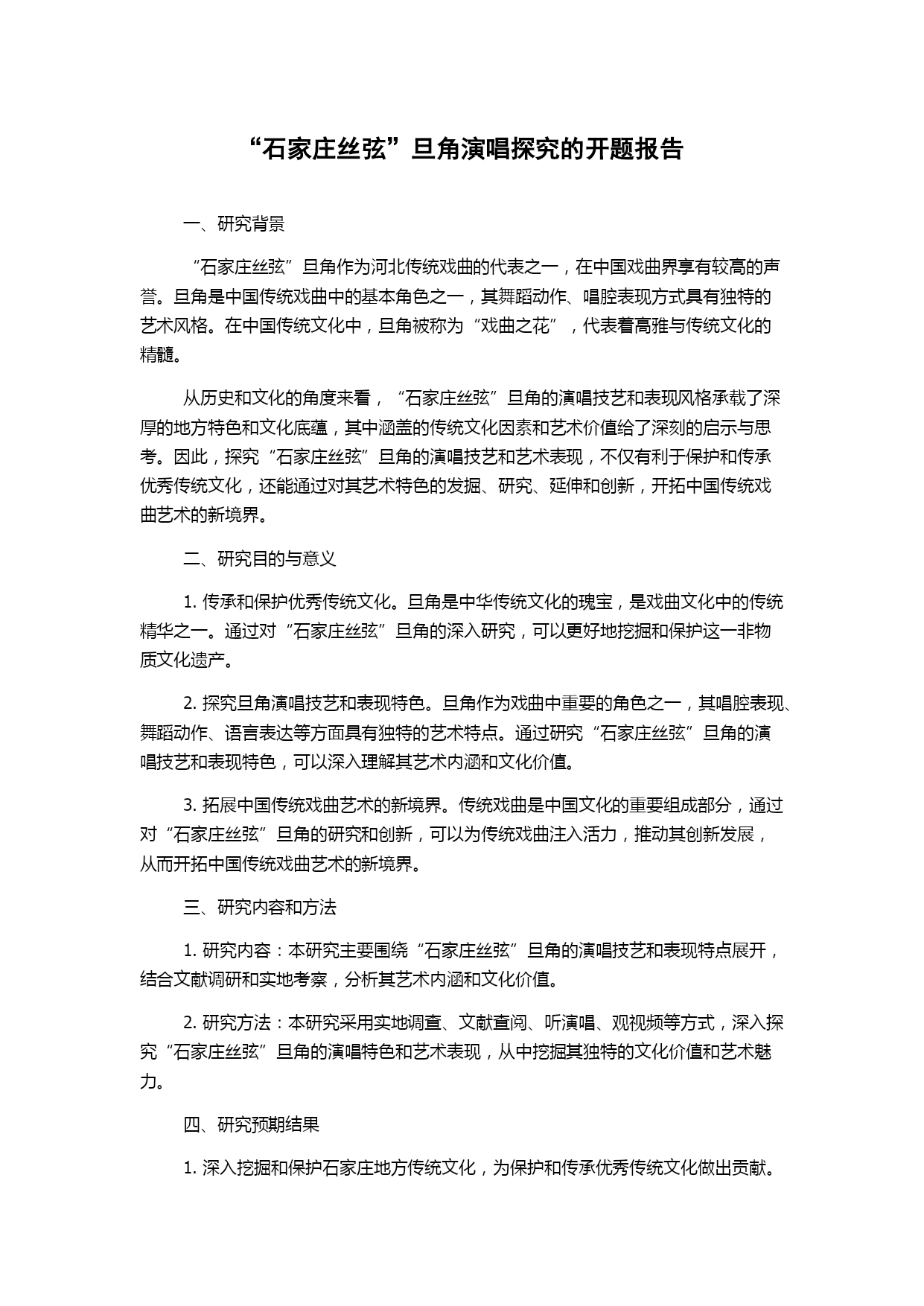 “石家庄丝弦”旦角演唱探究的开题报告一、研究背景“石家庄丝弦”旦角作为河北传统戏曲的代表之一,在中国戏曲界享有较高的声誉。旦角是中国传统戏曲中的基本角色之一,其舞蹈动作、唱腔表现方式具有独特的艺术风格。在中国传统文化中,旦角被称为“戏曲之花”,代表着高雅与传统文化的精髓。从历史和文化的角度来看,“石家庄丝弦”旦角的演唱技艺和表现风格承载了深厚的地方特色和文化底蕴,其中涵盖的传统文化因素和艺术价值给了深刻的启示与思考。因此,探究“石家庄丝弦”旦角的演唱技艺和艺术表现,不仅有利于保护和传承优秀传统文化,还能通
