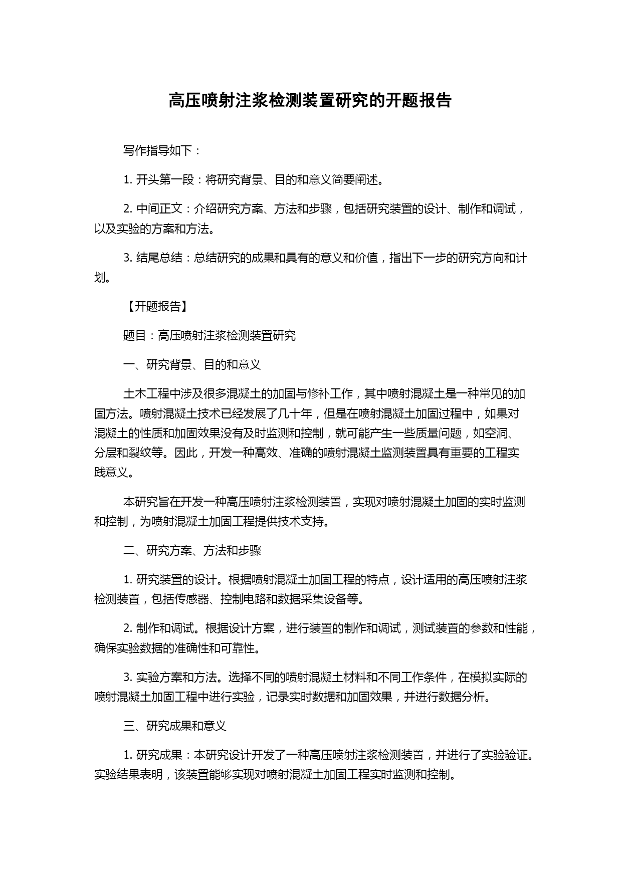 高压喷射注浆检测装置研究的开题报告写作指导如下:1.开头第一段:将研究背景、目的和意义简要阐述。2.中间正文:介绍研究方案、方法和步骤,包括研究装置的设计、制作和调试,以及实验的方案和方法。3.结尾总结:总结研究的成果和具有的意义和价值,指出下一步的研究方向和计划。【开题报告】题目:高压喷射注浆检测装置研究一、研究背景、目的和意义土木工程中涉及很多混凝土的加固与修补工作,其中喷射混凝土是一种常见的加固方法。喷射混凝土技术已经发展了几十年,但是在喷射混凝土加固过程中,如果对混凝土的性质和加固效果没有及时监测
