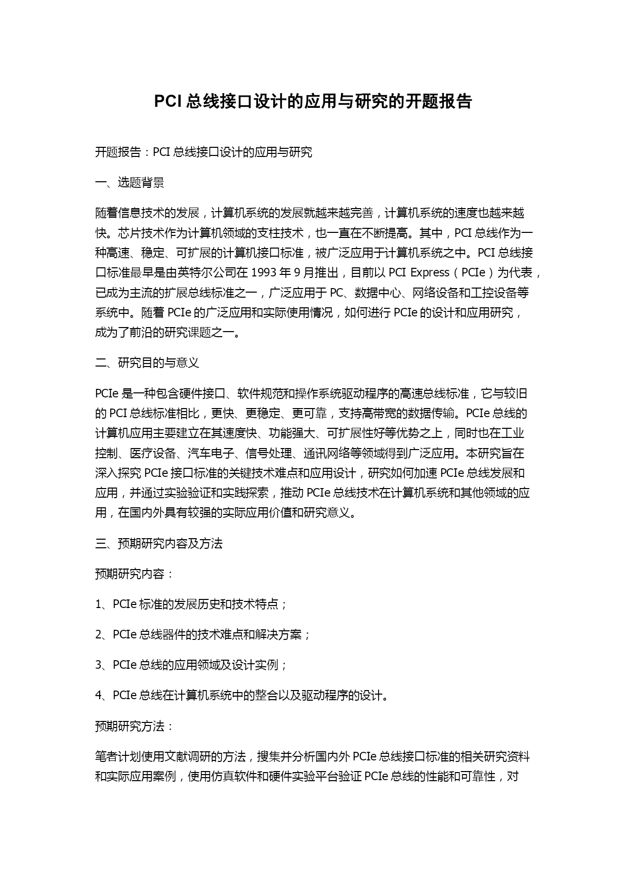 PCI总线接口设计的应用与研究的开题报告开题报告:PCI总线接口设计的应用与研究一、选题背景随着信息技术的发展,计算机系统的发展就越来越完善,计算机系统的速度也越来越快。芯片技术作为计算机领域的支柱技术,也一直在不断提高。其中,PCI总线作为一种高速、稳定、可扩展的计算机接口标准,被广泛应用于计算机系统之中。PCI总线接口标准最早是由英特尔公司在1993年9月推出,目前以PCIExpress(PCIe)为代表,已成为主流的扩展总线标准之一,广泛应用于PC、数据中心、网络设备和工控设备等系统中。随着PCIe