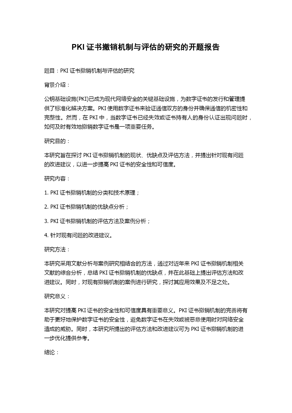 PKI证书撤销机制与评估的研究的开题报告题目:PKI证书撤销机制与评估的研究背景介绍:公钥基础设施(PKI)已成为现代网络安全的关键基础设施,为数字证书的发行和管理提供了标准化解决方案。PKI使用数字证书来验证通信双方的身份并确保通信的机密性和完整性。然而,在PKI中,当数字证书已经失效或证书持有人的身份认证出现问题时,如何及时有效地撤销数字证书是一项重要任务。研究目的:本研究旨在探讨PKI证书撤销机制的现状、优缺点及评估方法,并提出针对现有问题的改进建议,以进一步提高PKI证书的安全性和可信度。研究内容