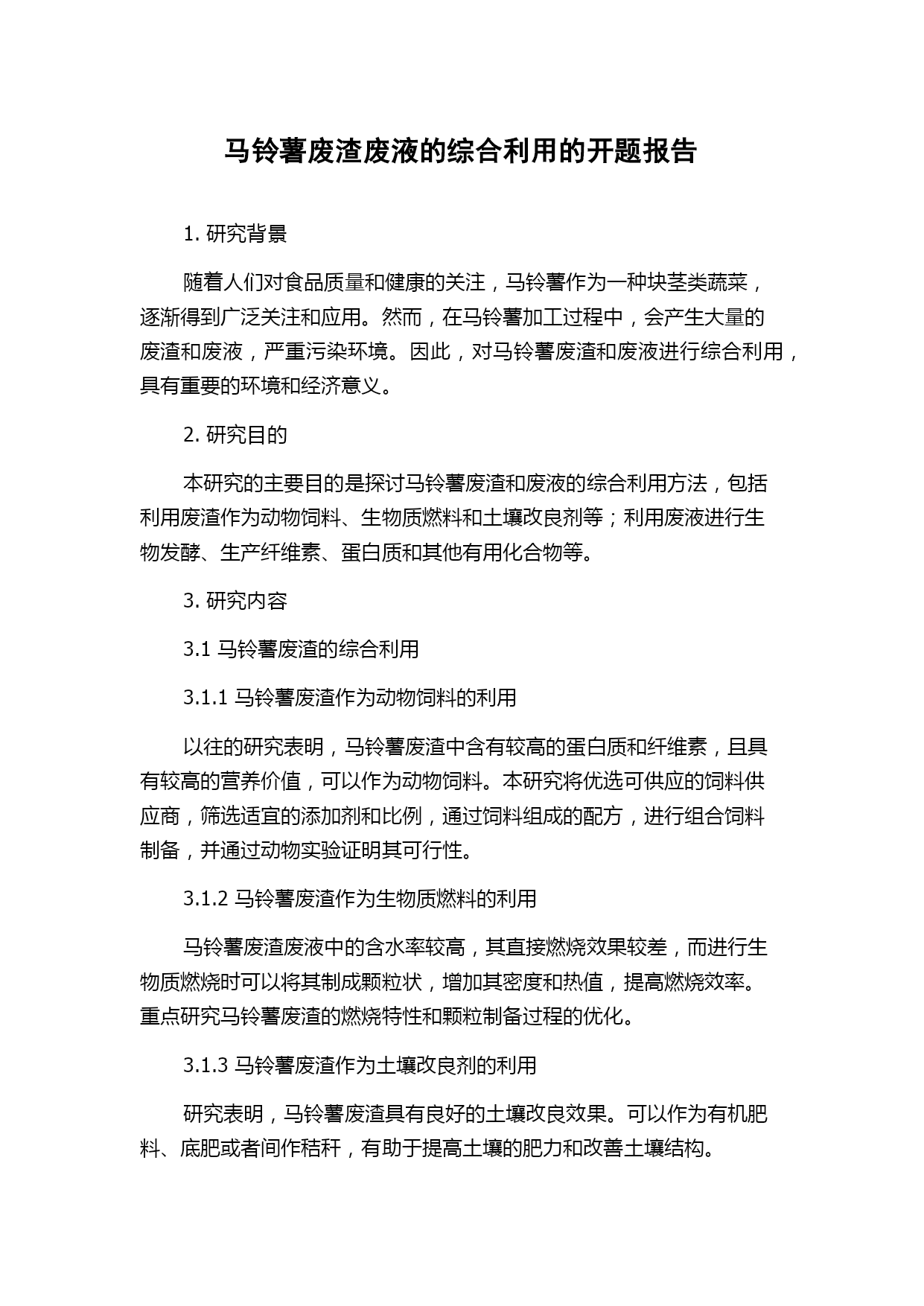 马铃薯废渣废液的综合利用的开题报告1.研究背景随着人们对食品质量和健康的关注,马铃薯作为一种块茎类蔬菜,逐渐得到广泛关注和应用。然而,在马铃薯加工过程中,会产生大量的废渣和废液,严重污染环境。因此,对马铃薯废渣和废液进行综合利用,具有重要的环境和经济意义。2.研究目的本研究的主要目的是探讨马铃薯废渣和废液的综合利用方法,包括利用废渣作为动物饲料、生物质燃料和土壤改良剂等;利用废液进行生物发酵、生产纤维素、蛋白质和其他有用化合物等。3.研究内容3.1马铃薯废渣的综合利用3.1.1马铃薯废渣作为动物饲料的利用