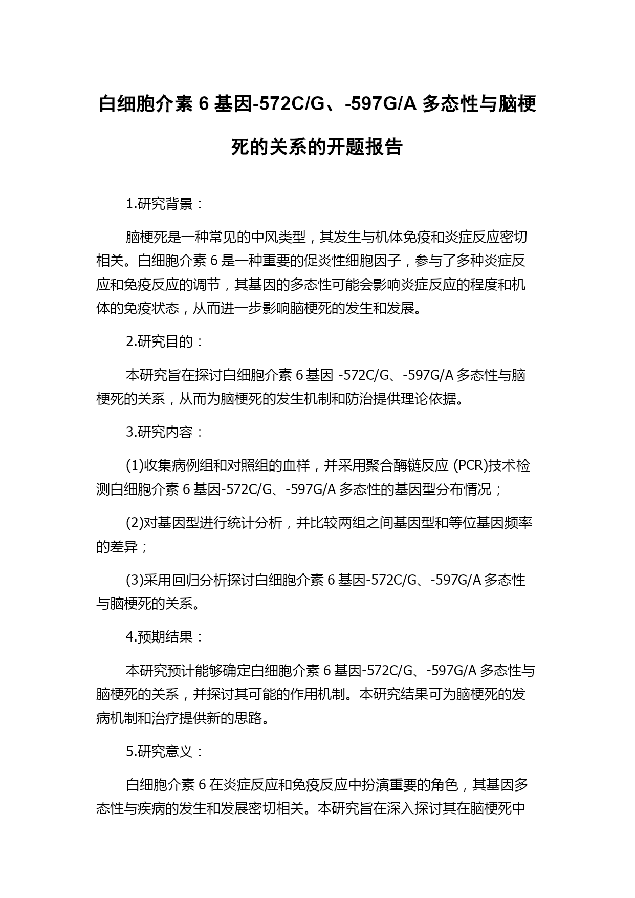 白细胞介素6基因-572C/G、-597G/A多态性与脑梗死的关系的开题报告1.研究背景:脑梗死是一种常见的中风类型,其发生与机体免疫和炎症反应密切相关。白细胞介素6是一种重要的促炎性细胞因子,参与了多种炎症反应和免疫反应的调节,其基因的多态性可能会影响炎症反应的程度和机体的免疫状态,从而进一步影响脑梗死的发生和发展。2.研究目的:本研究旨在探讨白细胞介素6基因-572C/G、-597G/A多态性与脑梗死的关系,从而为脑梗死的发生机制和防治提供理论依据。3.研究内容:(1)收集病例组和对照组的血样,并采用
