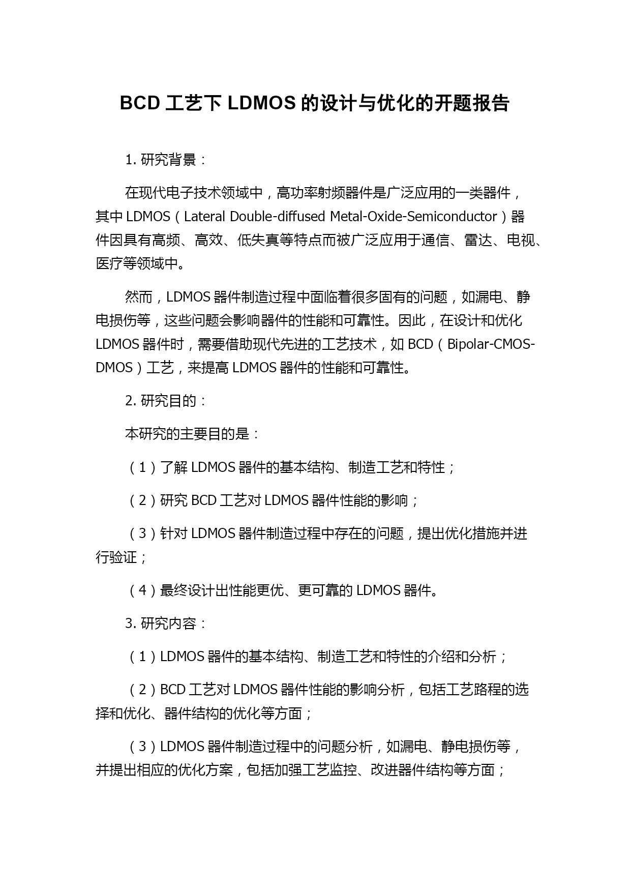 BCD工艺下LDMOS的设计与优化的开题报告1.研究背景:在现代电子技术领域中,高功率射频器件是广泛应用的一类器件,其中LDMOS(LateralDouble-diffusedMetal-Oxide-Semiconductor)器件因具有高频、高效、低失真等特点而被广泛应用于通信、雷达、电视、医疗等领域中。然而,LDMOS器件制造过程中面临着很多固有的问题,如漏电、静电损伤等,这些问题会影响器件的性能和可靠性。因此,在设计和优化LDMOS器件时,需要借助现代先进的工艺技术,如BCD(Bipolar-CMO
