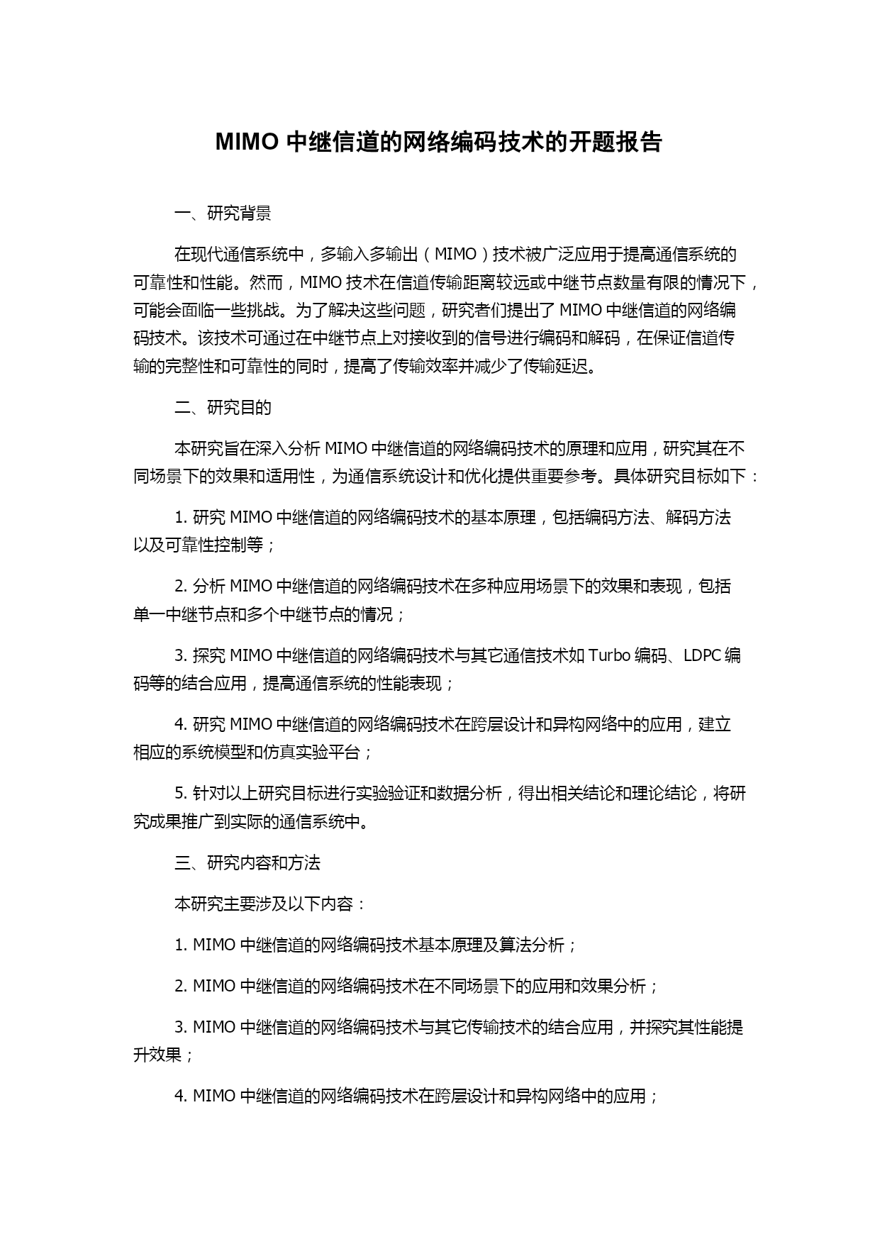 MIMO中继信道的网络编码技术的开题报告一、研究背景在现代通信系统中,多输入多输出(MIMO)技术被广泛应用于提高通信系统的可靠性和性能。然而,MIMO技术在信道传输距离较远或中继节点数量有限的情况下,可能会面临一些挑战。为了解决这些问题,研究者们提出了MIMO中继信道的网络编码技术。该技术可通过在中继节点上对接收到的信号进行编码和解码,在保证信道传输的完整性和可靠性的同时,提高了传输效率并减少了传输延迟。二、研究目的本研究旨在深入分析MIMO中继信道的网络编码技术的原理和应用,研究其在不同场景下的效果和
