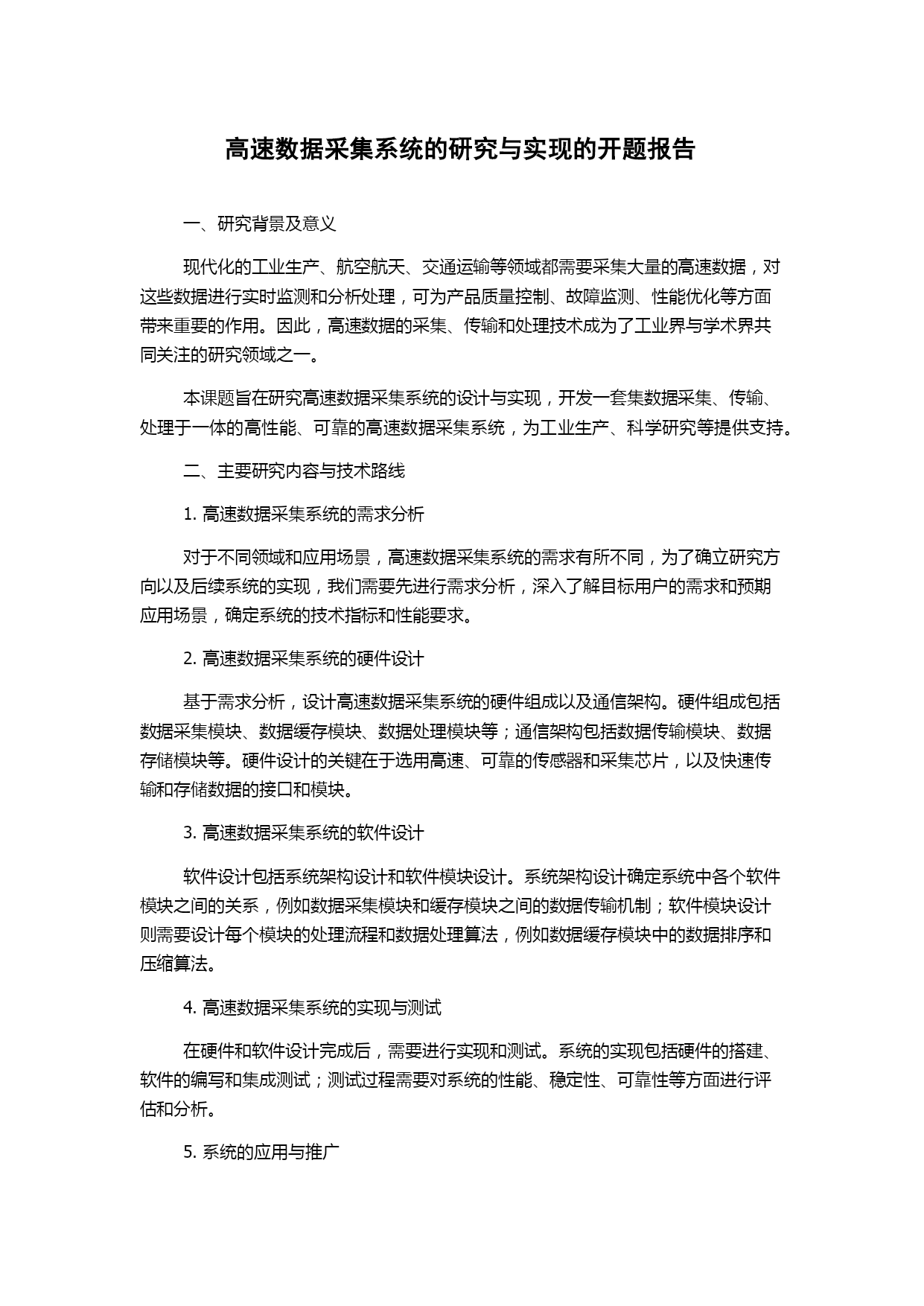 高速数据采集系统的研究与实现的开题报告一、研究背景及意义现代化的工业生产、航空航天、交通运输等领域都需要采集大量的高速数据,对这些数据进行实时监测和分析处理,可为产品质量控制、故障监测、性能优化等方面带来重要的作用。因此,高速数据的采集、传输和处理技术成为了工业界与学术界共同关注的研究领域之一。本课题旨在研究高速数据采集系统的设计与实现,开发一套集数据采集、传输、处理于一体的高性能、可靠的高速数据采集系统,为工业生产、科学研究等提供支持。二、主要研究内容与技术路线1.高速数据采集系统的需求分析对于不同领域