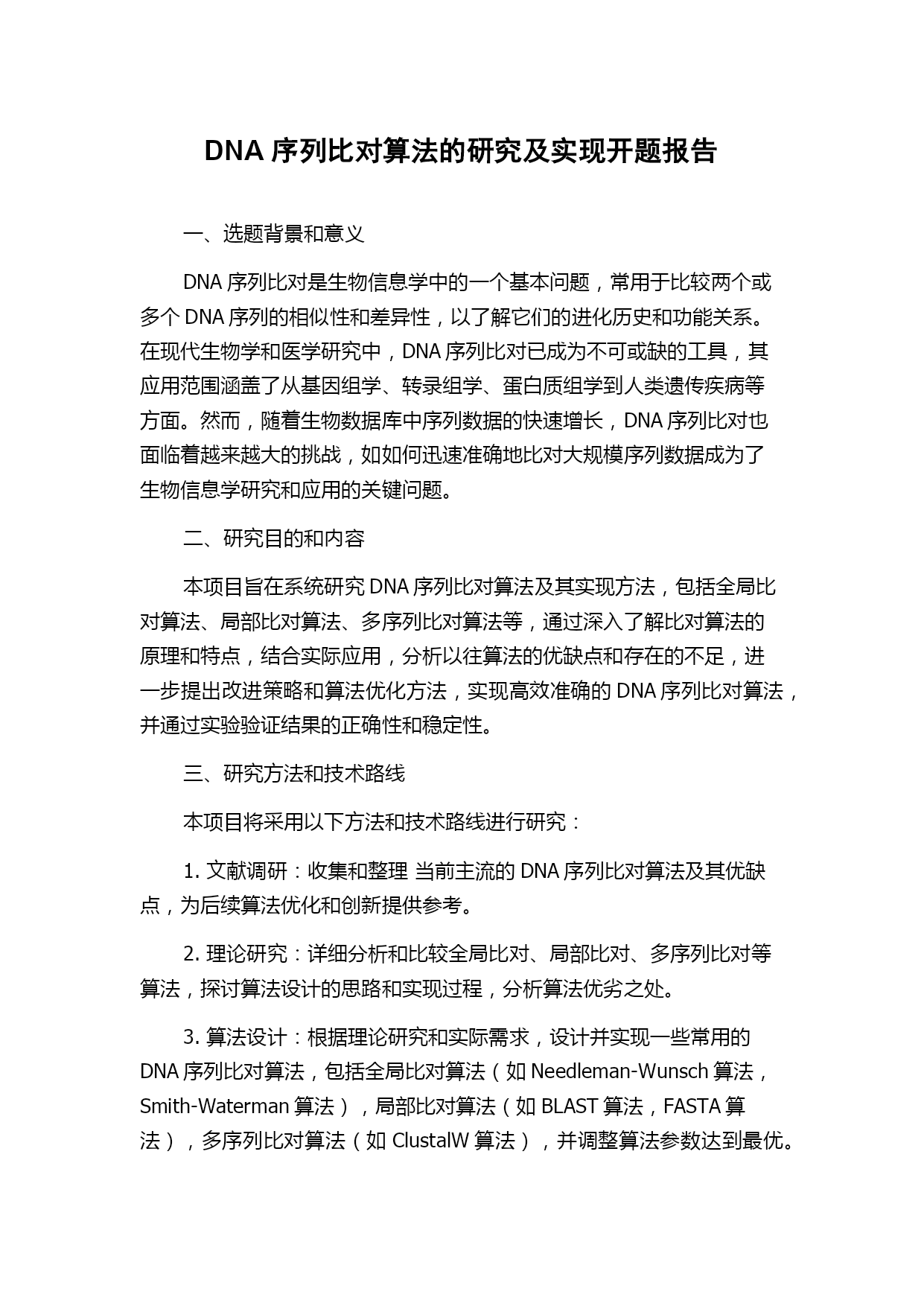DNA序列比对算法的研究及实现开题报告一、选题背景和意义DNA序列比对是生物信息学中的一个基本问题,常用于比较两个或多个DNA序列的相似性和差异性,以了解它们的进化历史和功能关系。在现代生物学和医学研究中,DNA序列比对已成为不可或缺的工具,其应用范围涵盖了从基因组学、转录组学、蛋白质组学到人类遗传疾病等方面。然而,随着生物数据库中序列数据的快速增长,DNA序列比对也面临着越来越大的挑战,如如何迅速准确地比对大规模序列数据成为了生物信息学研究和应用的关键问题。二、研究目的和内容本项目旨在系统研究DNA序列