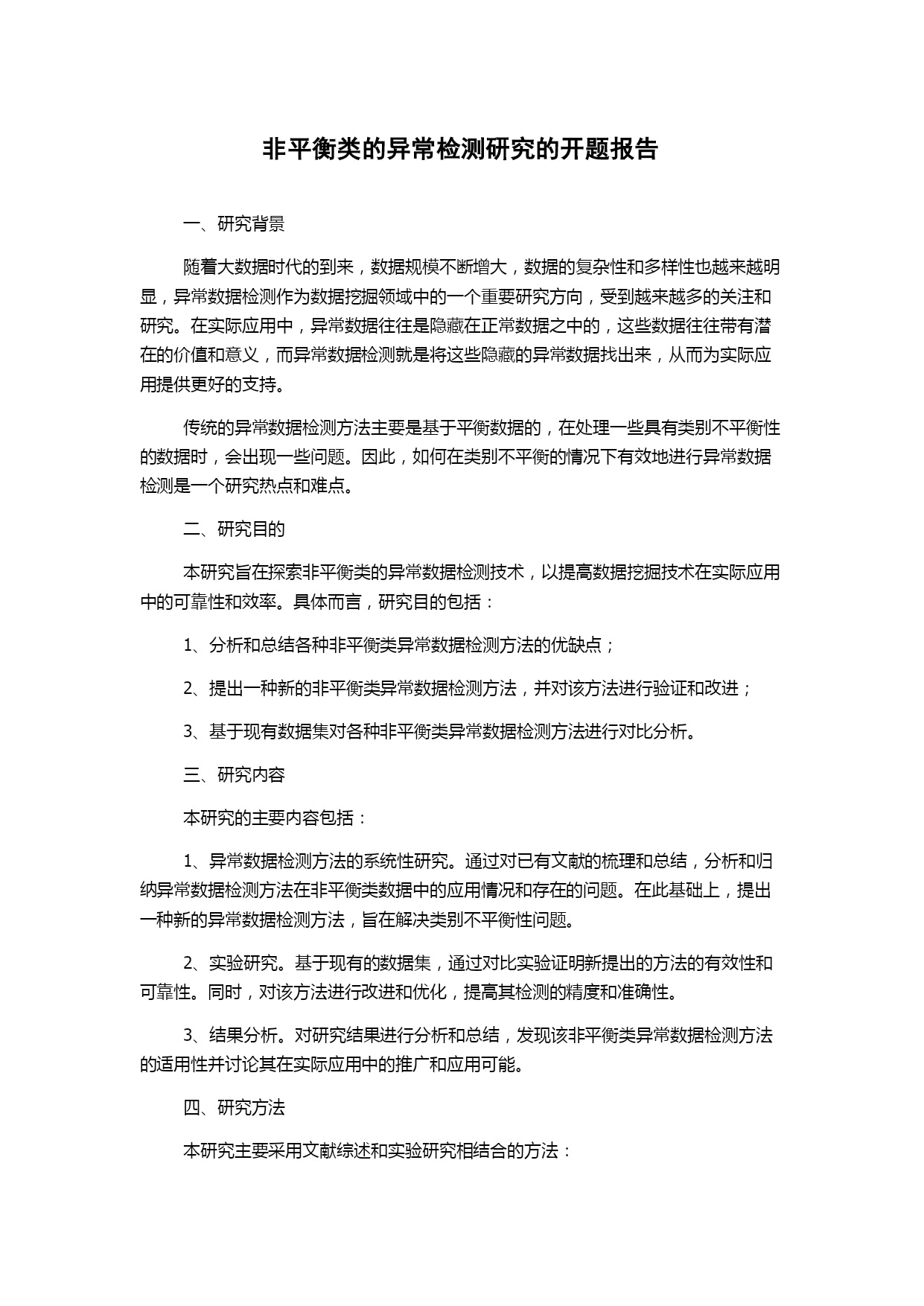 非平衡类的异常检测研究的开题报告一、研究背景随着大数据时代的到来,数据规模不断增大,数据的复杂性和多样性也越来越明显,异常数据检测作为数据挖掘领域中的一个重要研究方向,受到越来越多的关注和研究。在实际应用中,异常数据往往是隐藏在正常数据之中的,这些数据往往带有潜在的价值和意义,而异常数据检测就是将这些隐藏的异常数据找出来,从而为实际应用提供更好的支持。传统的异常数据检测方法主要是基于平衡数据的,在处理一些具有类别不平衡性的数据时,会出现一些问题。因此,如何在类别不平衡的情况下有效地进行异常数据检测是一个研