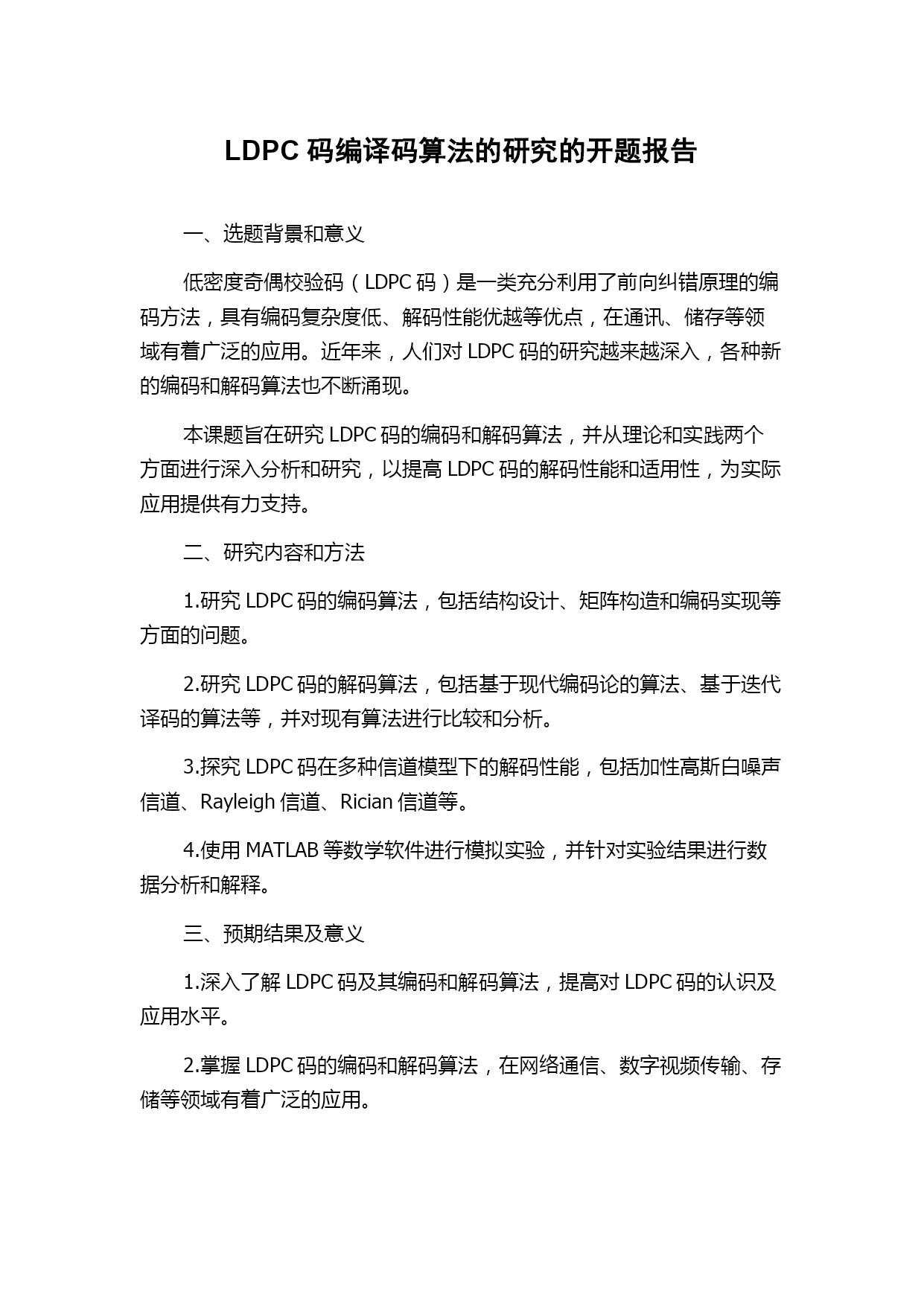 LDPC码编译码算法的研究的开题报告一、选题背景和意义低密度奇偶校验码(LDPC码)是一类充分利用了前向纠错原理的编码方法,具有编码复杂度低、解码性能优越等优点,在通讯、储存等领域有着广泛的应用。近年来,人们对LDPC码的研究越来越深入,各种新的编码和解码算法也不断涌现。本课题旨在研究LDPC码的编码和解码算法,并从理论和实践两个方面进行深入分析和研究,以提高LDPC码的解码性能和适用性,为实际应用提供有力支持。二、研究内容和方法1.研究LDPC码的编码算法,包括结构设计、矩阵构造和编码实现等方面的问题。