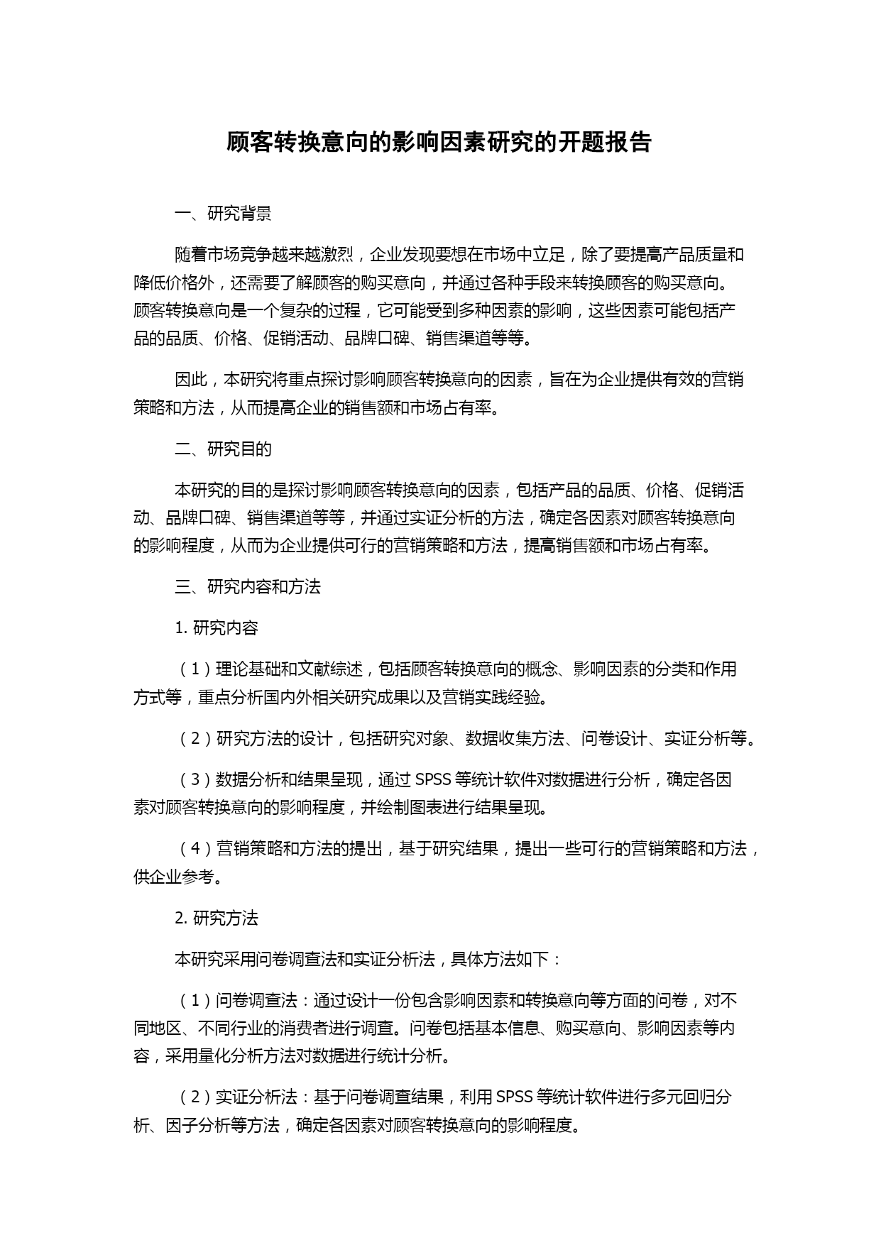 顾客转换意向的影响因素研究的开题报告一、研究背景随着市场竞争越来越激烈,企业发现要想在市场中立足,除了要提高产品质量和降低价格外,还需要了解顾客的购买意向,并通过各种手段来转换顾客的购买意向。顾客转换意向是一个复杂的过程,它可能受到多种因素的影响,这些因素可能包括产品的品质、价格、促销活动、品牌口碑、销售渠道等等。因此,本研究将重点探讨影响顾客转换意向的因素,旨在为企业提供有效的营销策略和方法,从而提高企业的销售额和市场占有率。二、研究目的本研究的目的是探讨影响顾客转换意向的因素,包括产品的品质、价格、促