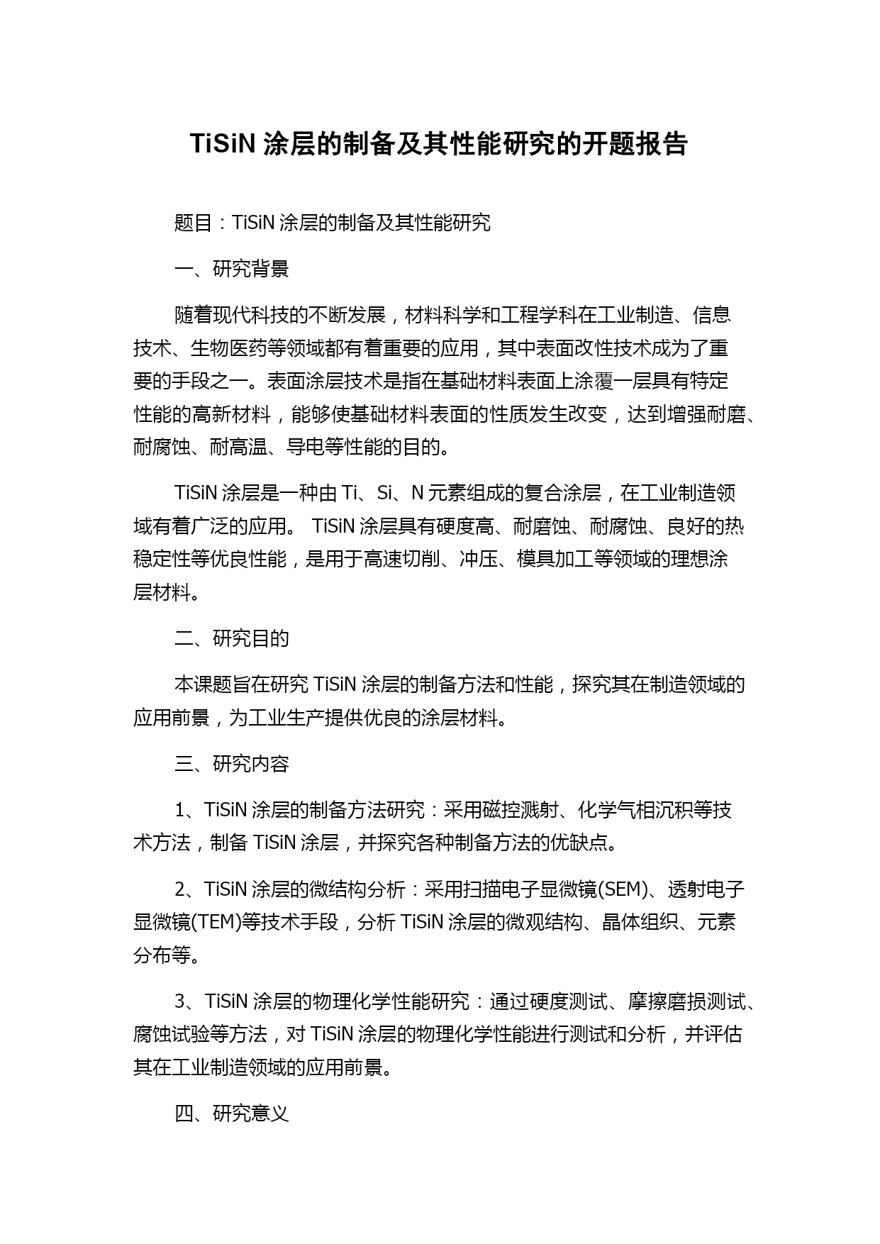 TiSiN涂层的制备及其性能研究的开题报告题目:TiSiN涂层的制备及其性能研究一、研究背景随着现代科技的不断发展,材料科学和工程学科在工业制造、信息技术、生物医药等领域都有着重要的应用,其中表面改性技术成为了重要的手段之一。表面涂层技术是指在基础材料表面上涂覆一层具有特定性能的高新材料,能够使基础材料表面的性质发生改变,达到增强耐磨、耐腐蚀、耐高温、导电等性能的目的。TiSiN涂层是一种由Ti、Si、N元素组成的复合涂层,在工业制造领域有着广泛的应用。TiSiN涂层具有硬度高、耐磨蚀、耐腐蚀、良好的热稳