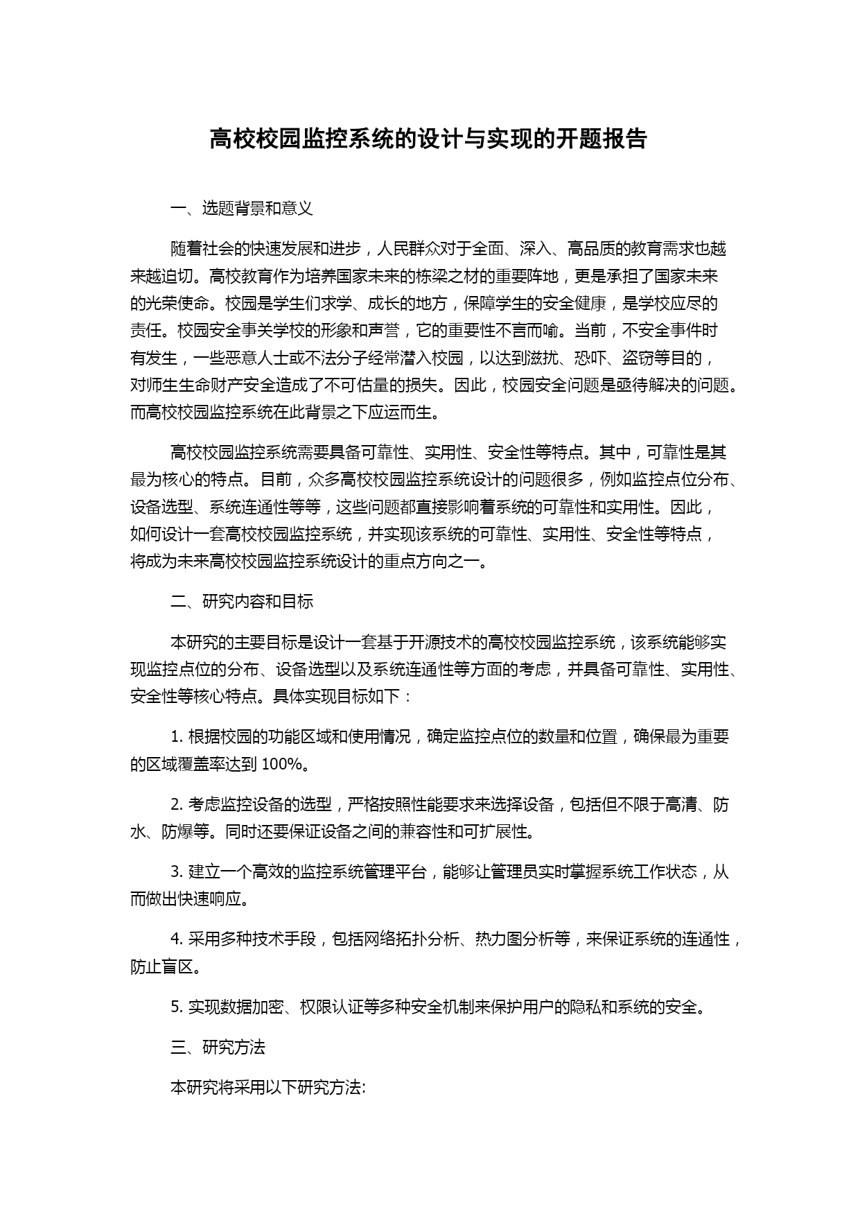 高校校园监控系统的设计与实现的开题报告一、选题背景和意义随着社会的快速发展和进步,人民群众对于全面、深入、高品质的教育需求也越来越迫切。高校教育作为培养国家未来的栋梁之材的重要阵地,更是承担了国家未来的光荣使命。校园是学生们求学、成长的地方,保障学生的安全健康,是学校应尽的责任。校园安全事关学校的形象和声誉,它的重要性不言而喻。当前,不安全事件时有发生,一些恶意人士或不法分子经常潜入校园,以达到滋扰、恐吓、盗窃等目的,对师生生命财产安全造成了不可估量的损失。因此,校园安全问题是亟待解决的问题。而高校校园监