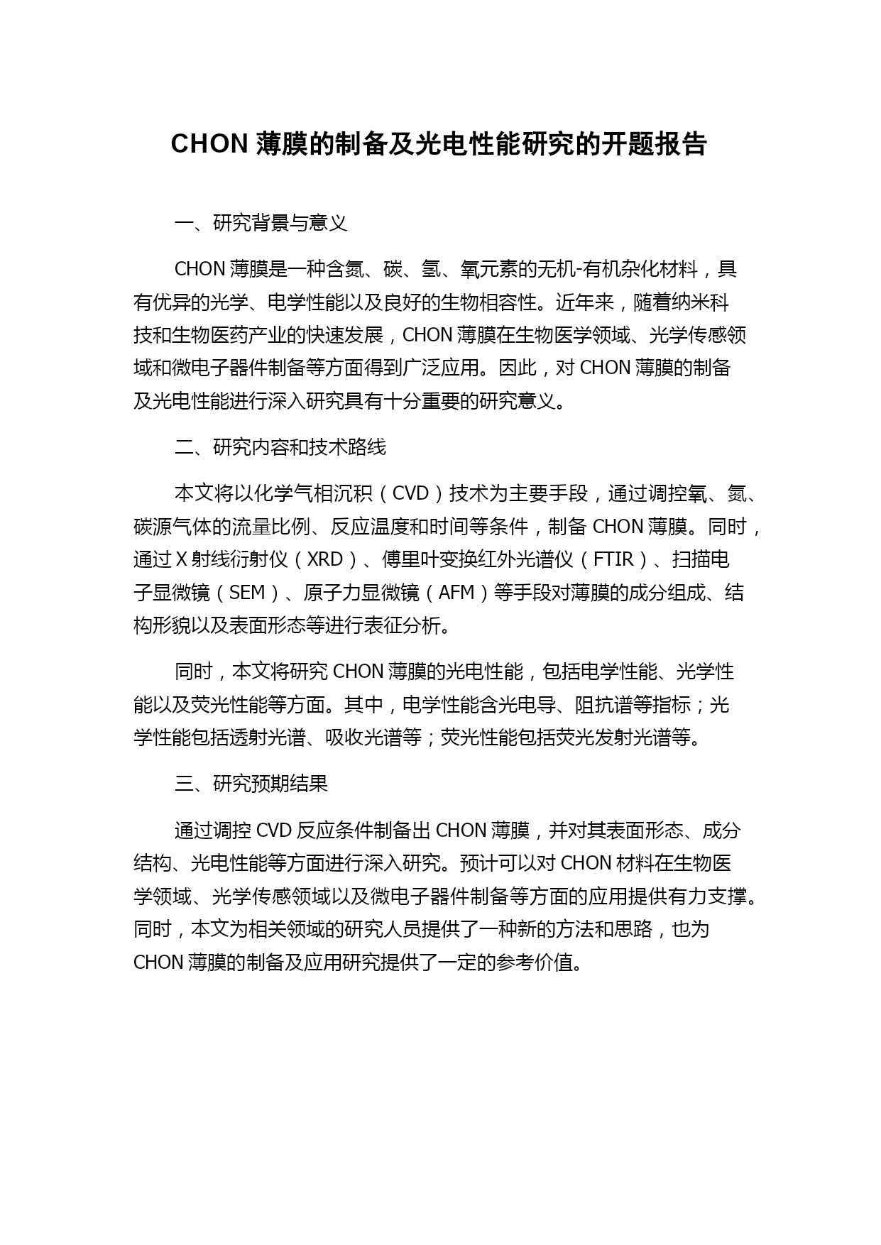 CHON薄膜的制备及光电性能研究的开题报告一、研究背景与意义CHON薄膜是一种含氮、碳、氢、氧元素的无机-有机杂化材料,具有优异的光学、电学性能以及良好的生物相容性。近年来,随着纳米科技和生物医药产业的快速发展,CHON薄膜在生物医学领域、光学传感领域和微电子器件制备等方面得到广泛应用。因此,对CHON薄膜的制备及光电性能进行深入研究具有十分重要的研究意义。二、研究内容和技术路线本文将以化学气相沉积(CVD)技术为主要手段,通过调控氧、氮、碳源气体的流量比例、反应温度和时间等条件,制备CHON薄膜。同时,