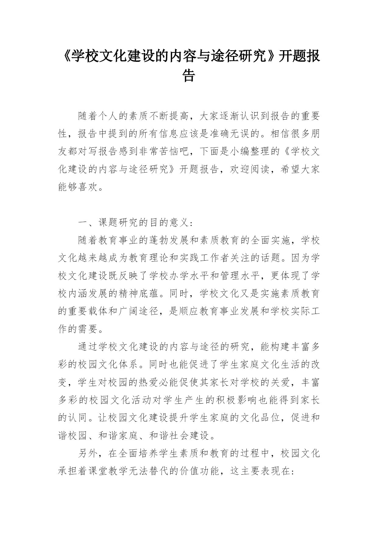 《学校文化建设的内容与途径研究》开题报告随着个人的素质不断提高,大家逐渐认识到报告的重要性,报告中提到的所有信息应该是准确无误的。相信很多朋友都对写报告感到非常苦恼吧,下面是小编整理的《学校文化建设的内容与途径研究》开题报告,欢迎阅读,希望大家能够喜欢。一、课题研究的目的意义:随着教育事业的蓬勃发展和素质教育的全面实施,学校文化越来越成为教育理论和实践工作者关注的话题。因为学校文化建设既反映了学校办学水平和管理水平,更体现了学校内涵发展的精神底蕴。同时,学校文化又是实施素质教育的重要载体和广阔途径,是顺应