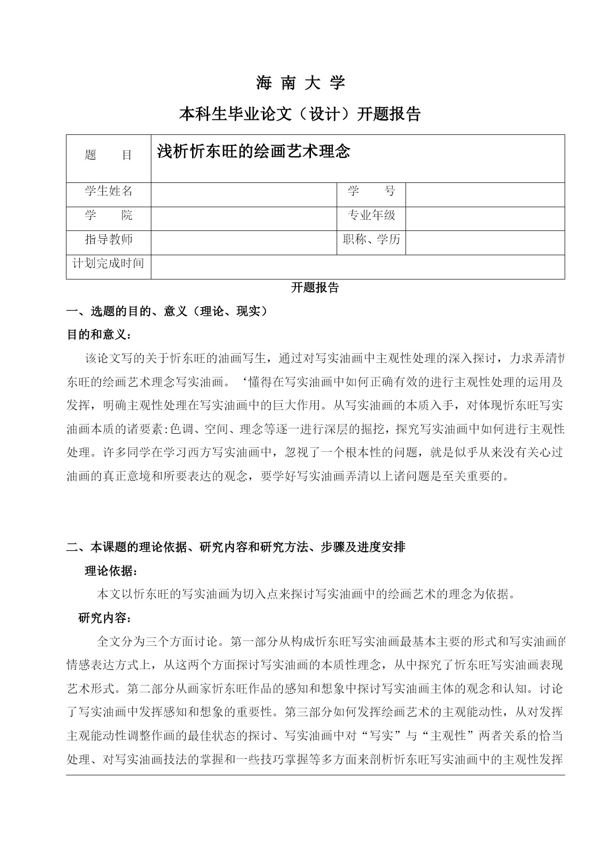海南大学本科生毕业论文(设计)开题报告题目浅析忻东旺的绘画艺术理念学生姓名学号学院专业年级指导教师职称、学历计划完成时间开题报告选题的目的、意义(理论、现实)目的和意义:该论文写的关于忻东旺的油画写生,通过对写实油画中主观性处理的深入探讨,力求弄清忻东旺的绘画艺术理念写实油画。‘懂得在写实油画中如何正确有效的进行主观性处理的运用及发挥,明确主观性处理在写实油画中的巨大作用。从写实油画的本质入手,对体现忻东旺写实油画本质的诸要素:色调、空间、理念等逐一进行深层的掘挖,探究写实油画中如何进行主观性处理。许多同