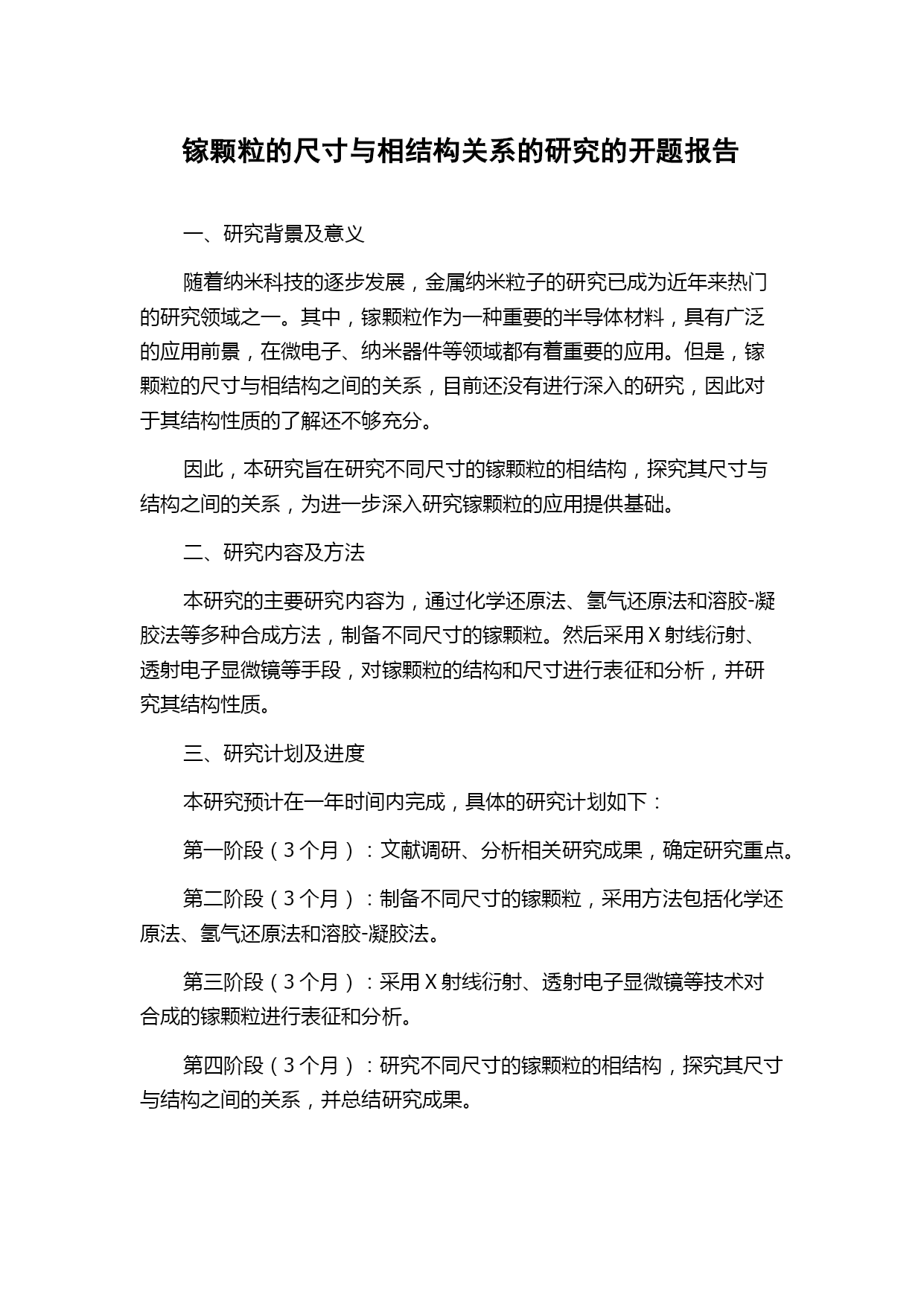 镓颗粒的尺寸与相结构关系的研究的开题报告一、研究背景及意义随着纳米科技的逐步发展,金属纳米粒子的研究已成为近年来热门的研究领域之一。其中,镓颗粒作为一种重要的半导体材料,具有广泛的应用前景,在微电子、纳米器件等领域都有着重要的应用。但是,镓颗粒的尺寸与相结构之间的关系,目前还没有进行深入的研究,因此对于其结构性质的了解还不够充分。因此,本研究旨在研究不同尺寸的镓颗粒的相结构,探究其尺寸与结构之间的关系,为进一步深入研究镓颗粒的应用提供基础。二、研究内容及方法本研究的主要研究内容为,通过化学还原法、氢气还原