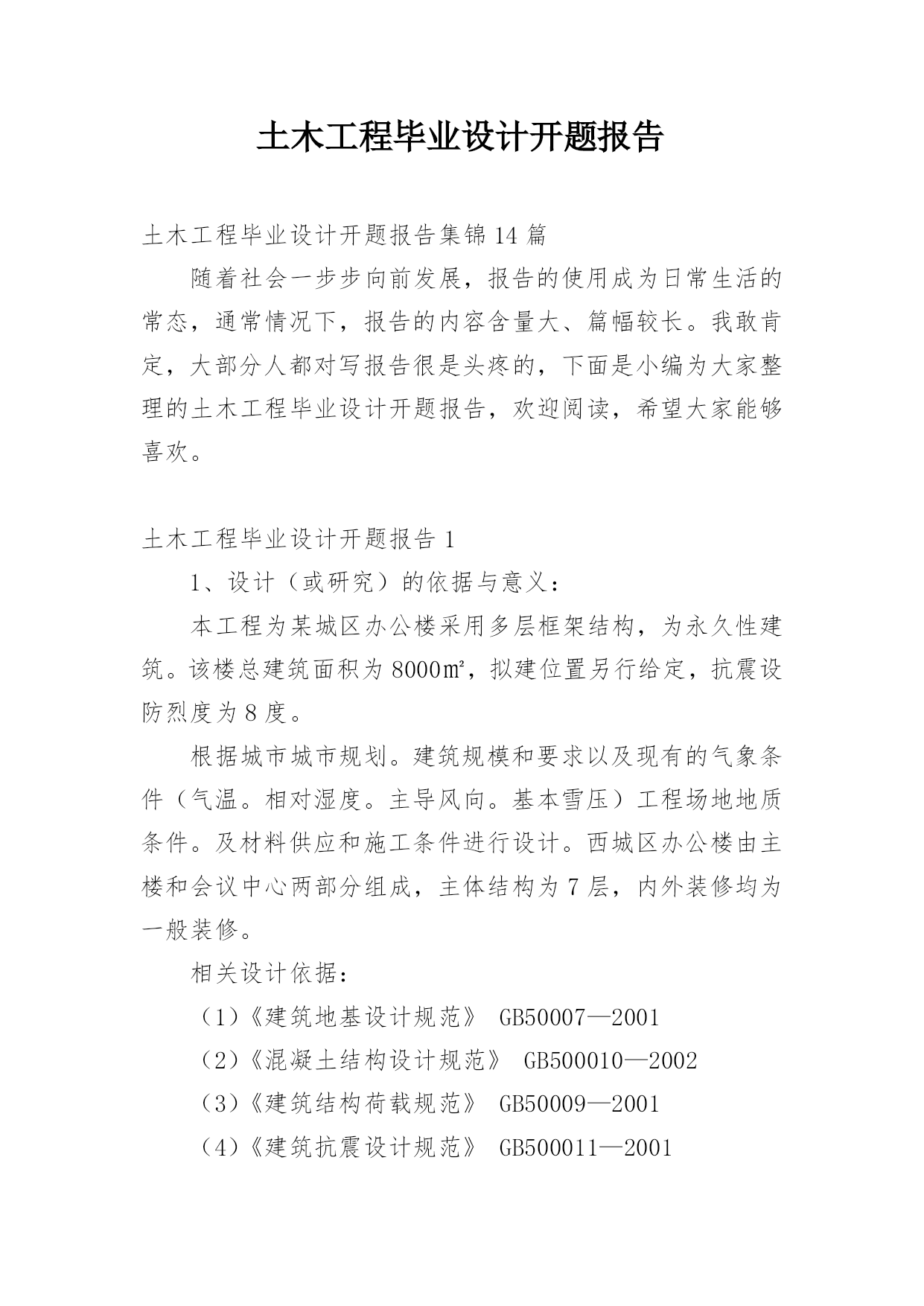 土木工程毕业设计开题报告土木工程毕业设计开题报告集锦14篇随着社会一步步向前发展,报告的使用成为日常生活的常态,通常情况下,报告的内容含量大、篇幅较长。我敢肯定,大部分人都对写报告很是头疼的,下面是小编为大家整理的土木工程毕业设计开题报告,欢迎阅读,希望大家能够喜欢。土木工程毕业设计开题报告11、设计(或研究)的依据与意义:本工程为某城区办公楼采用多层框架结构,为永久性建筑。该楼总建筑面积为8000㎡,拟建位置另行给定,抗震设防烈度为8度。根据城市城市规划。建筑规模和要求以及现有的气象条件(气温。相对湿度