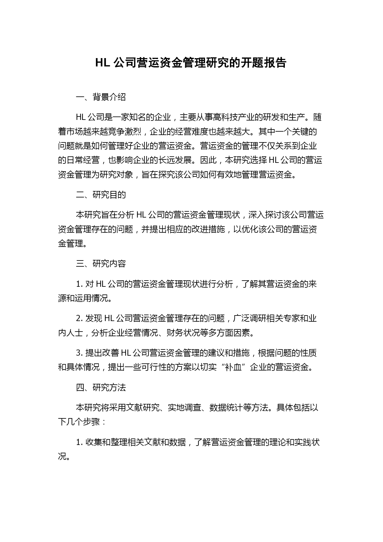 HL公司营运资金管理研究的开题报告一、背景介绍HL公司是一家知名的企业,主要从事高科技产业的研发和生产。随着市场越来越竞争激烈,企业的经营难度也越来越大。其中一个关键的问题就是如何管理好企业的营运资金。营运资金的管理不仅关系到企业的日常经营,也影响企业的长远发展。因此,本研究选择HL公司的营运资金管理为研究对象,旨在探究该公司如何有效地管理营运资金。二、研究目的本研究旨在分析HL公司的营运资金管理现状,深入探讨该公司营运资金管理存在的问题,并提出相应的改进措施,以优化该公司的营运资金管理。三、研究内容1.