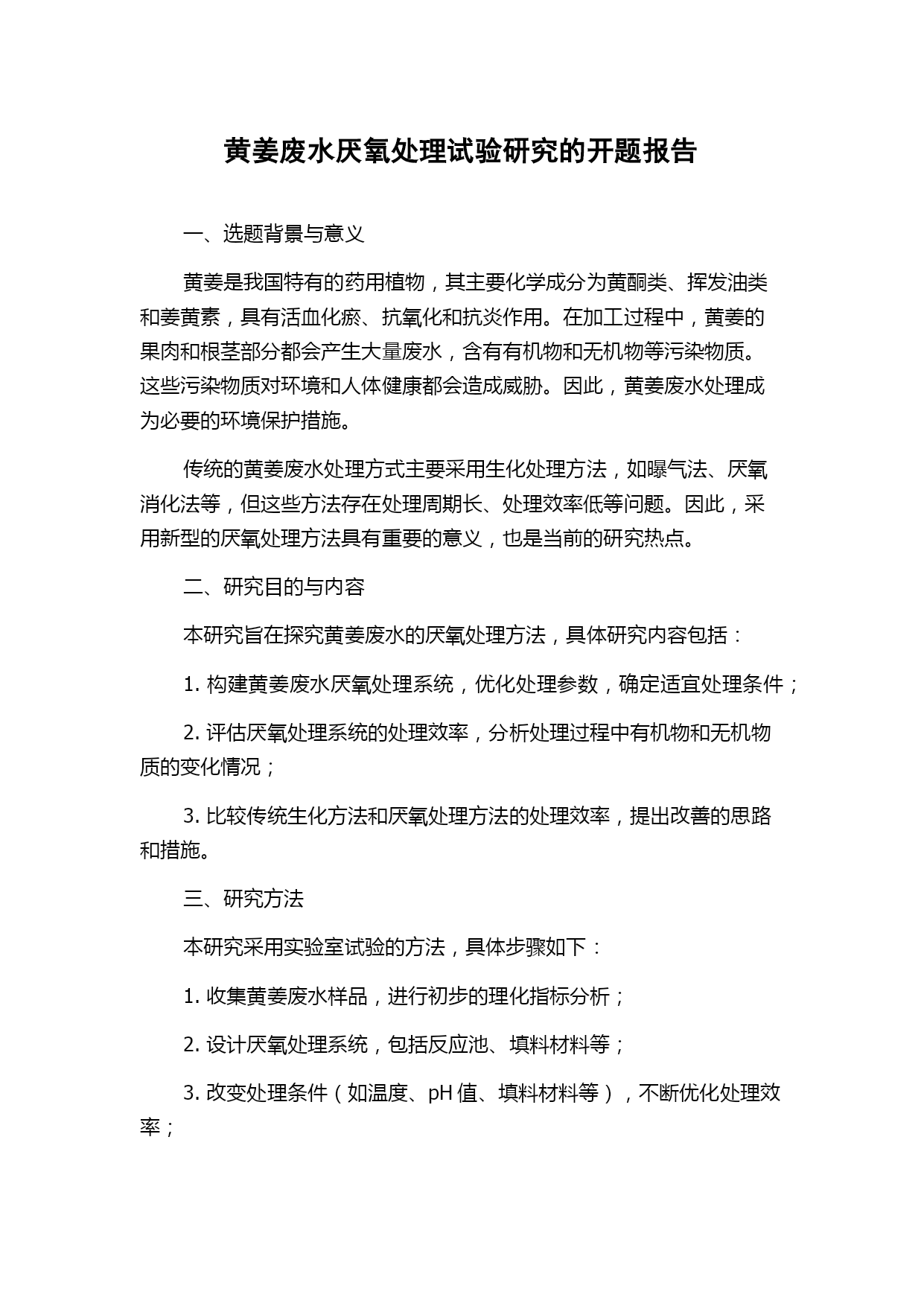 黄姜废水厌氧处理试验研究的开题报告一、选题背景与意义黄姜是我国特有的药用植物,其主要化学成分为黄酮类、挥发油类和姜黄素,具有活血化瘀、抗氧化和抗炎作用。在加工过程中,黄姜的果肉和根茎部分都会产生大量废水,含有有机物和无机物等污染物质。这些污染物质对环境和人体健康都会造成威胁。因此,黄姜废水处理成为必要的环境保护措施。传统的黄姜废水处理方式主要采用生化处理方法,如曝气法、厌氧消化法等,但这些方法存在处理周期长、处理效率低等问题。因此,采用新型的厌氧处理方法具有重要的意义,也是当前的研究热点。二、研究目的与内