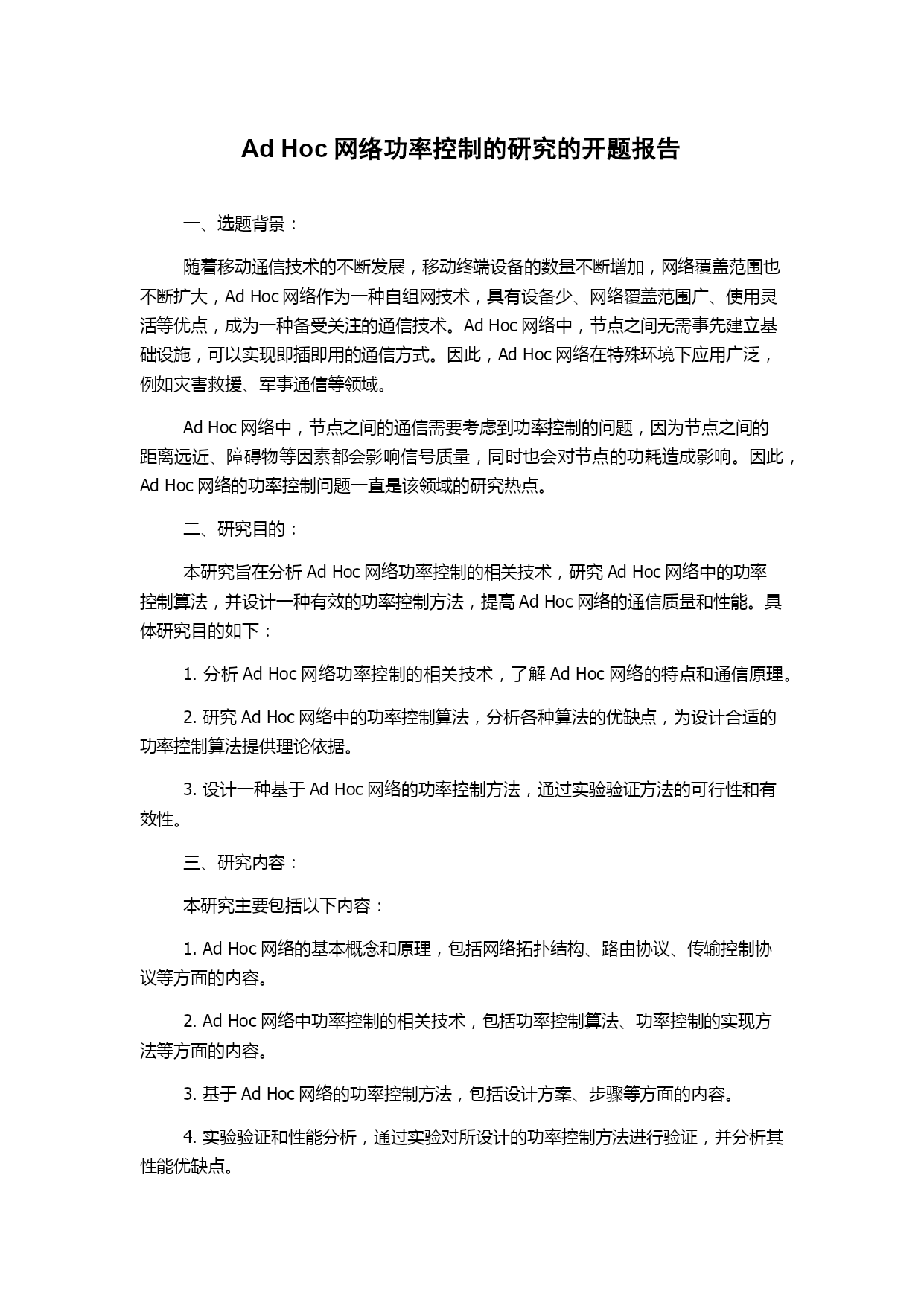 AdHoc网络功率控制的研究的开题报告一、选题背景:随着移动通信技术的不断发展,移动终端设备的数量不断增加,网络覆盖范围也不断扩大,AdHoc网络作为一种自组网技术,具有设备少、网络覆盖范围广、使用灵活等优点,成为一种备受关注的通信技术。AdHoc网络中,节点之间无需事先建立基础设施,可以实现即插即用的通信方式。因此,AdHoc网络在特殊环境下应用广泛,例如灾害救援、军事通信等领域。AdHoc网络中,节点之间的通信需要考虑到功率控制的问题,因为节点之间的距离远近、障碍物等因素都会影响信号质量,同时也会对节
