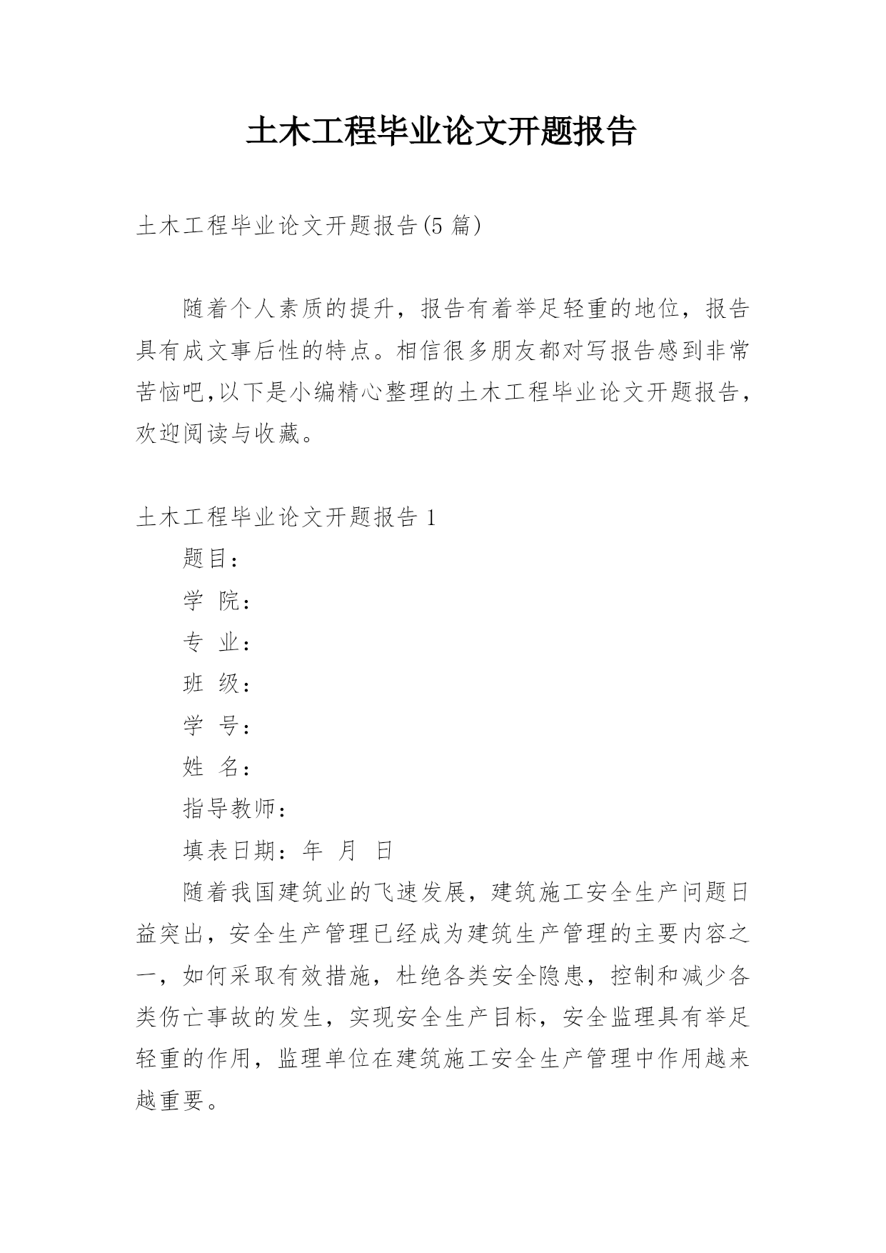 土木工程毕业论文开题报告土木工程毕业论文开题报告(5篇)随着个人素质的提升,报告有着举足轻重的地位,报告具有成文事后性的特点。相信很多朋友都对写报告感到非常苦恼吧,以下是小编精心整理的土木工程毕业论文开题报告,欢迎阅读与收藏。土木工程毕业论文开题报告1题目:学院:专业:班级:学号:姓名:指导教师:填表日期:年月日随着我国建筑业的飞速发展,建筑施工安全生产问题日益突出,安全生产管理已经成为建筑生产管理的主要内容之一,如何采取有效措施,杜绝各类安全隐患,控制和减少各类伤亡事故的发生,实现安全生产目标,安全监理