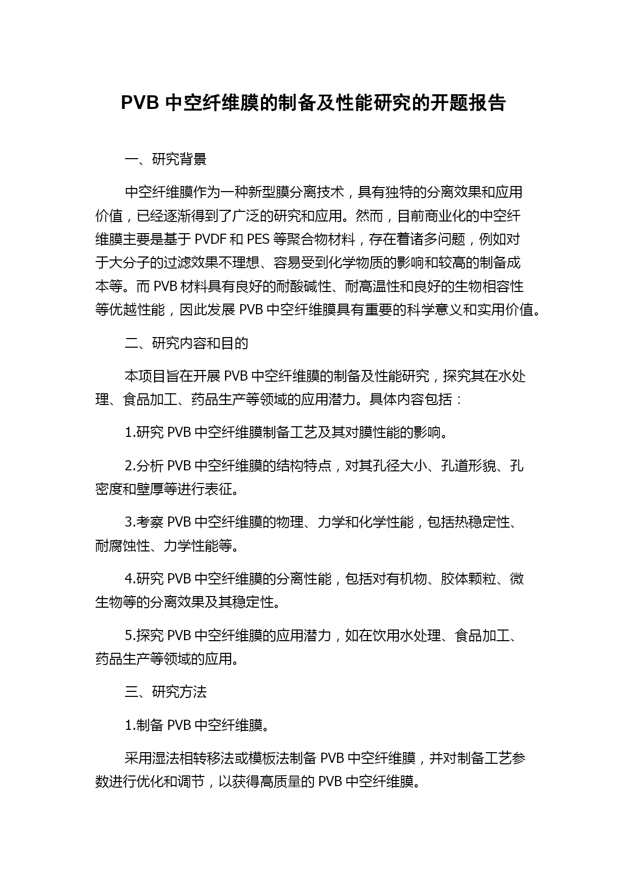 PVB中空纤维膜的制备及性能研究的开题报告一、研究背景中空纤维膜作为一种新型膜分离技术,具有独特的分离效果和应用价值,已经逐渐得到了广泛的研究和应用。然而,目前商业化的中空纤维膜主要是基于PVDF和PES等聚合物材料,存在着诸多问题,例如对于大分子的过滤效果不理想、容易受到化学物质的影响和较高的制备成本等。而PVB材料具有良好的耐酸碱性、耐高温性和良好的生物相容性等优越性能,因此发展PVB中空纤维膜具有重要的科学意义和实用价值。二、研究内容和目的本项目旨在开展PVB中空纤维膜的制备及性能研究,探究其在水处