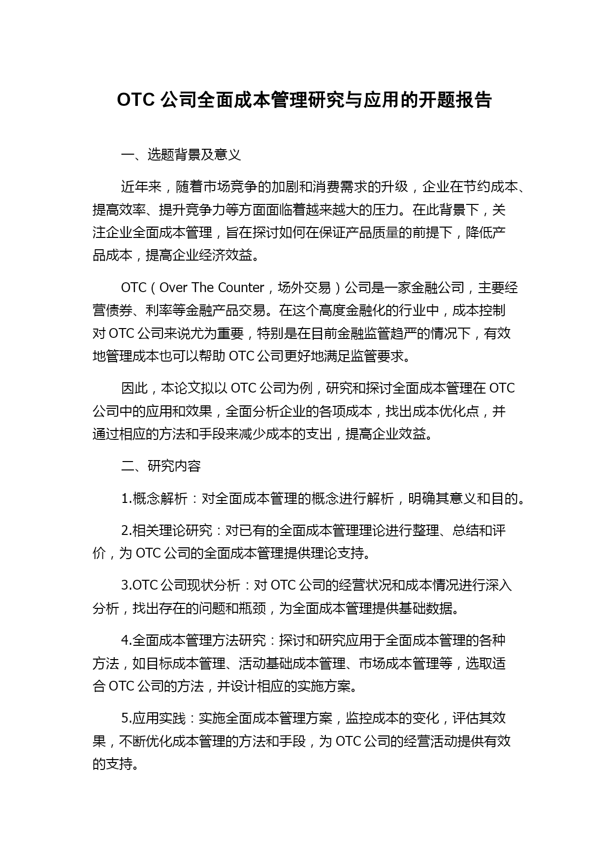OTC公司全面成本管理研究与应用的开题报告一、选题背景及意义近年来,随着市场竞争的加剧和消费需求的升级,企业在节约成本、提高效率、提升竞争力等方面面临着越来越大的压力。在此背景下,关注企业全面成本管理,旨在探讨如何在保证产品质量的前提下,降低产品成本,提高企业经济效益。OTC(OverTheCounter,场外交易)公司是一家金融公司,主要经营债券、利率等金融产品交易。在这个高度金融化的行业中,成本控制对OTC公司来说尤为重要,特别是在目前金融监管趋严的情况下,有效地管理成本也可以帮助OTC公司更好地满足