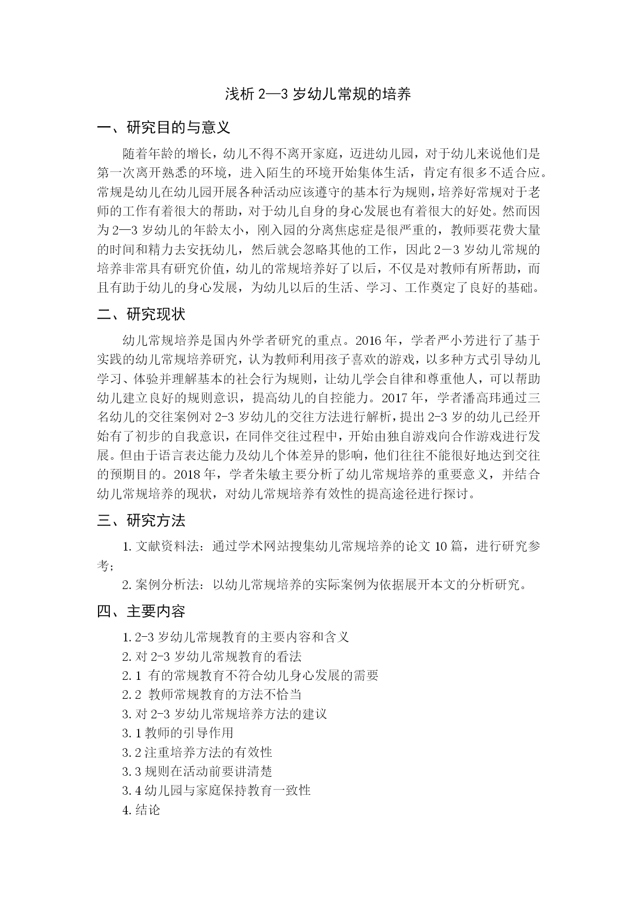 浅析2—3岁幼儿常规的培养一、研究目的与意义随着年龄的增长,幼儿不得不离开家庭,迈进幼儿园,对于幼儿来说他们是第一次离开熟悉的环境,进入陌生的环境开始集体生活,肯定有很多不适合应。常规是幼儿在幼儿园开展各种活动应该遵守的基本行为规则,培养好常规对于老师的工作有着很大的帮助,对于幼儿自身的身心发展也有着很大的好处。然而因为2—3岁幼儿的年龄太小,刚入园的分离焦虑症是很严重的,教师要花费大量的时间和精力去安抚幼儿,然后就会忽略其他的工作,因此2―3岁幼儿常规的培养非常具有研究价值,幼儿的常规培养好了以后,不仅