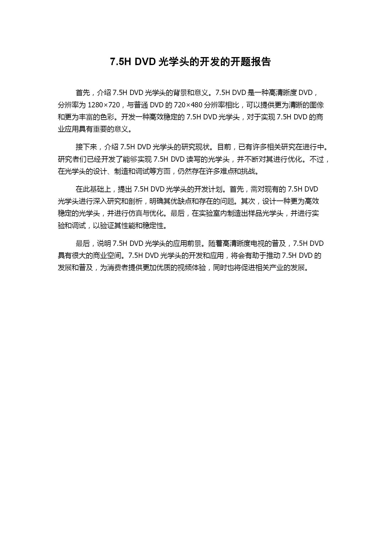 7.5HDVD光学头的开发的开题报告首先,介绍7.5HDVD光学头的背景和意义。7.5HDVD是一种高清晰度DVD,分辨率为1280×720,与普通DVD的720×480分辨率相比,可以提供更为清晰的图像和更为丰富的色彩。开发一种高效稳定的7.5HDVD光学头,对于实现7.5HDVD的商业应用具有重要的意义。接下来,介绍7.5HDVD光学头的研究现状。目前,已有许多相关研究在进行中。研究者们已经开发了能够实现7.5HDVD读写的光学头,并不断对其进行优化。不过,在光学头的设计、制造和调试等方面,仍然存在许