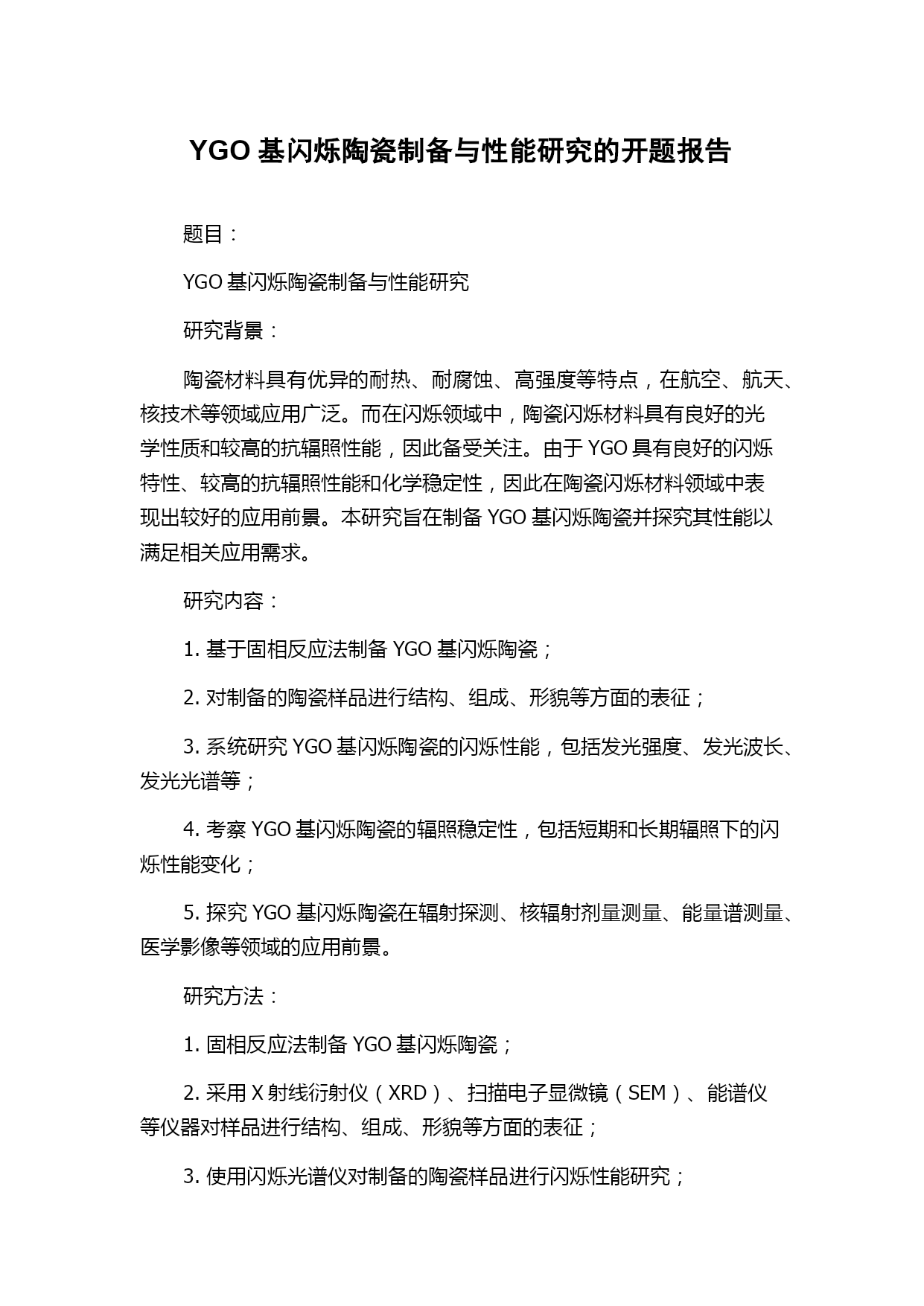 YGO基闪烁陶瓷制备与性能研究的开题报告题目:YGO基闪烁陶瓷制备与性能研究研究背景:陶瓷材料具有优异的耐热、耐腐蚀、高强度等特点,在航空、航天、核技术等领域应用广泛。而在闪烁领域中,陶瓷闪烁材料具有良好的光学性质和较高的抗辐照性能,因此备受关注。由于YGO具有良好的闪烁特性、较高的抗辐照性能和化学稳定性,因此在陶瓷闪烁材料领域中表现出较好的应用前景。本研究旨在制备YGO基闪烁陶瓷并探究其性能以满足相关应用需求。研究内容:1.基于固相反应法制备YGO基闪烁陶瓷;2.对制备的陶瓷样品进行结构、组成、形貌等方