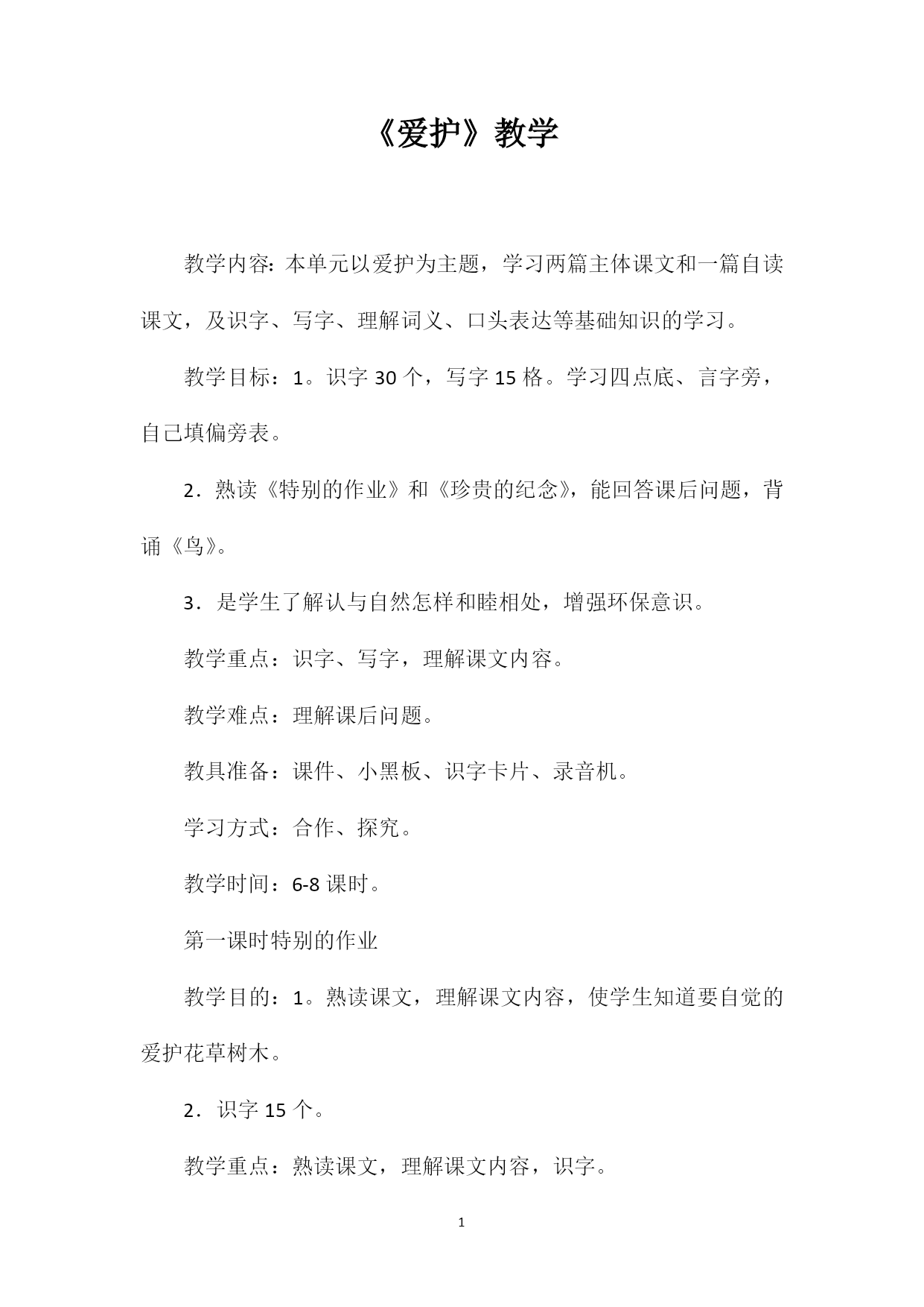 PAGEPAGE3《爱护》教学教学内容:本单元以爱护为主题,学习两篇主体课文和一篇自读课文,及识字、写字、理解词义、口头表达等基础知识的学习。教学目标:1。识字30个,写字15格。学习四点底、言字旁,自己填偏旁表。2.熟读《特别的作业》和《珍贵的纪念》,能回答课后问题,背诵《鸟》。3.是学生了解认与自然怎样和睦相处,增强环保意识。教学重点:识字、写字,理解课文内容。教学难点:理解课后问题。教具准备:课件、小黑板、识字卡片、录音机。学习方式:合作、探究。教学时间:6-8课时。第一课时特别的作业教