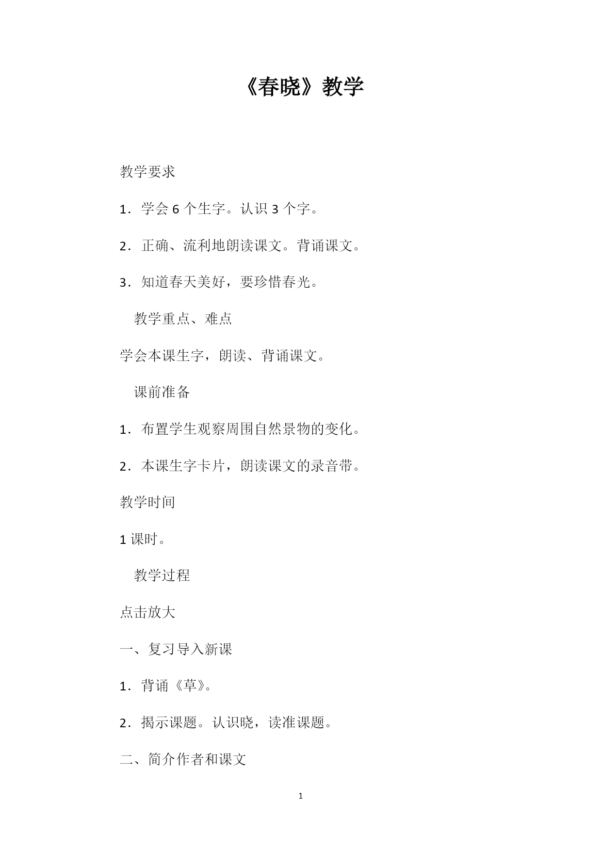 PAGEPAGE4《春晓》教学教学要求1.学会6个生字。认识3个字。2.正确、流利地朗读课文。背诵课文。3.知道春天美好,要珍惜春光。教学重点、难点学会本课生字,朗读、背诵课文。课前准备1.布置学生观察周围自然景物的变化。2.本课生字卡片,朗读课文的录音带。教学时间1课时。教学过程点击放大一、复习导入新课1.背诵《草》。2.揭示课题。认识晓,读准课题。二、简介作者和课文1.作者:唐代诗人孟浩然。2.以故事形式介绍古诗。大意是诗人夜读入睡,半夜被风声雨声惊醒,一会儿又睡了。直到鸟鸣声传来才发现天