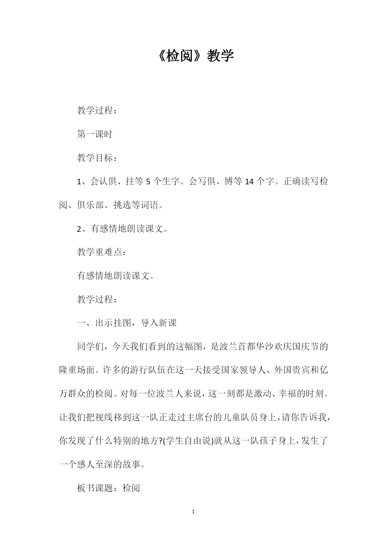 PAGEPAGE5《检阅》教学教学过程:第一课时教学目标:1、会认俱、拄等5个生字。会写俱、博等14个字。正确读写检阅、俱乐部、挑选等词语。2、有感情地朗读课文。教学重难点:有感情地朗读课文。教学过程:一、出示挂图,导入新课同学们,今天我们看到的这幅图,是波兰首都华沙欢庆国庆节的隆重场面。许多的游行队伍在这一天接受国家领导人、外国贵宾和亿万群众的检阅。对每一位波兰人来说,这一刻都是激动、幸福的时刻。让我们把视线移到这一队正走过主席台的儿童队员身上,请你告诉我,你发现了什么特别的地方?(学生自由