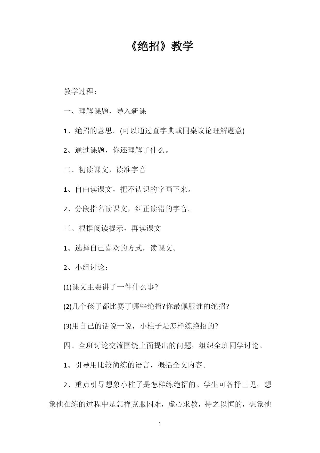 PAGEPAGE2《绝招》教学教学过程:一、理解课题,导入新课1、绝招的意思。(可以通过查字典或同桌议论理解题意)2、通过课题,你还理解了什么。二、初读课文,读准字音1、自由读课文,把不认识的字画下来。2、分段指名读课文,纠正读错的字音。三、根据阅读提示,再读课文1、选择自己喜欢的方式,读课文。2、小组讨论:(1)课文主要讲了一件什么事?(2)几个孩子都比赛了哪些绝招?你最佩服谁的绝招?(3)用自己的话说一说,小柱子是怎样练绝招的?四、全班讨论交流围绕上面提出的问题,组织全班同学讨论。1、引导