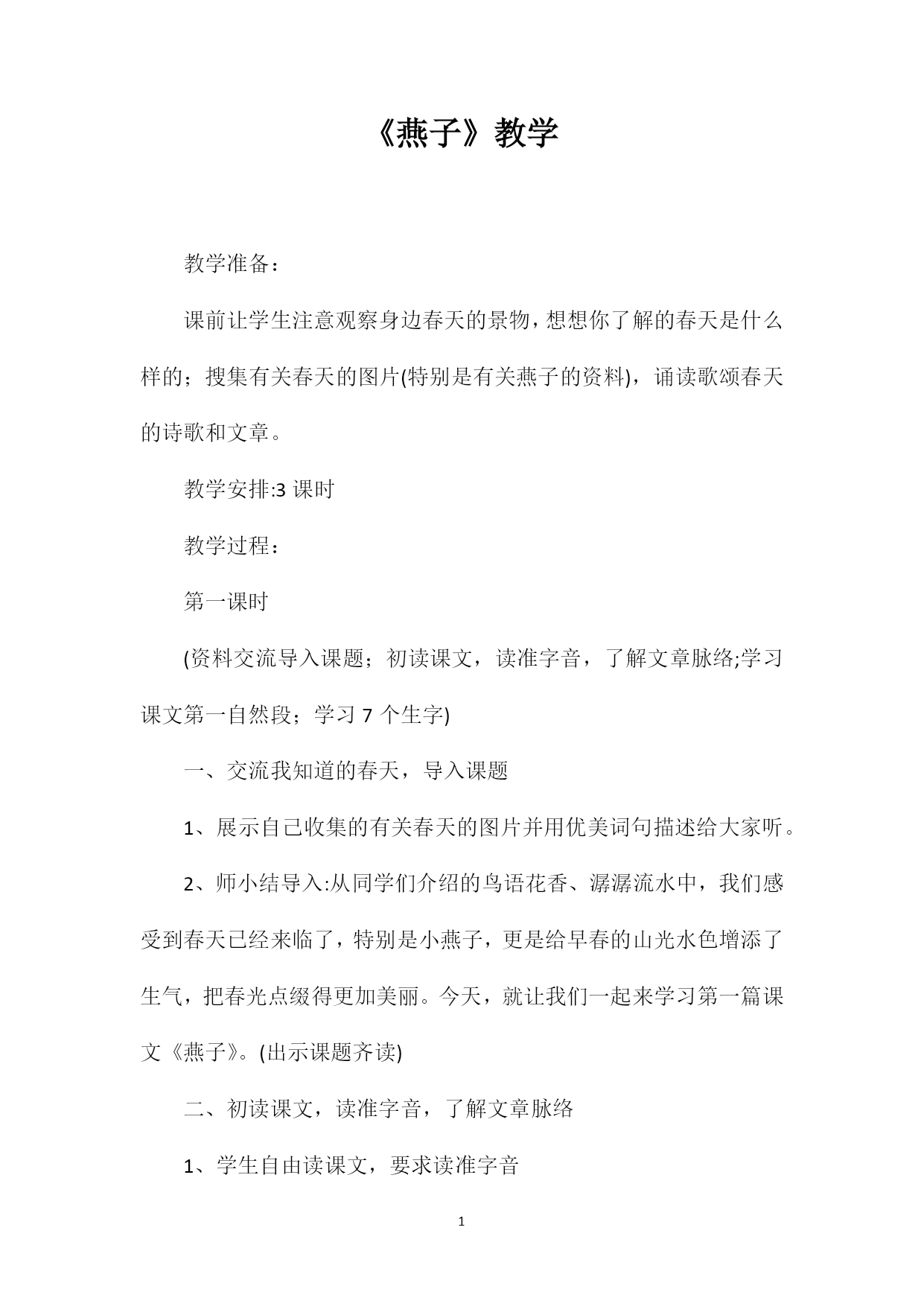 PAGEPAGE7《燕子》教学教学准备:课前让学生注意观察身边春天的景物,想想你了解的春天是什么样的;搜集有关春天的图片(特别是有关燕子的资料),诵读歌颂春天的诗歌和文章。教学安排:3课时教学过程:第一课时(资料交流导入课题;初读课文,读准字音,了解文章脉络;学习课文第一自然段;学习7个生字)一、交流我知道的春天,导入课题1、展示自己收集的有关春天的图片并用优美词句描述给大家听。2、师小结导入:从同学们介绍的鸟语花香、潺潺流水中,我们感受到春天已经来临了,特别是小燕子,更是给早春的山光水色增添