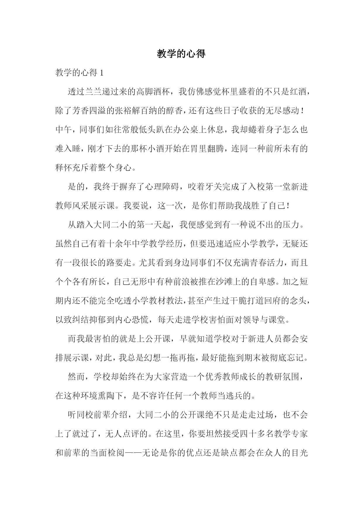 教学的心得教学的心得1透过兰兰递过来的高脚酒杯,我仿佛感觉杯里盛着的不只是红酒,除了芳香四溢的张裕解百纳的醇香,还有这些日子收获的无尽感动!中午,同事们如往常般低头趴在办公桌上休息,我却蜷着身子怎么也难入睡,刚才下去的那杯小酒开始在胃里翻腾,连同一种前所未有的释怀充斥着整个身心。是的,我终于摒弃了心理障碍,咬着牙关完成了入校第一堂新进教师风采展示课。我要说,这一次,是你们帮助我战胜了自己!从踏入大同二小的第一天起,我便感觉到有一种说不出的压力。虽然自己有着十余年中学教学经历,但要迅速适应小学教学,无疑还有