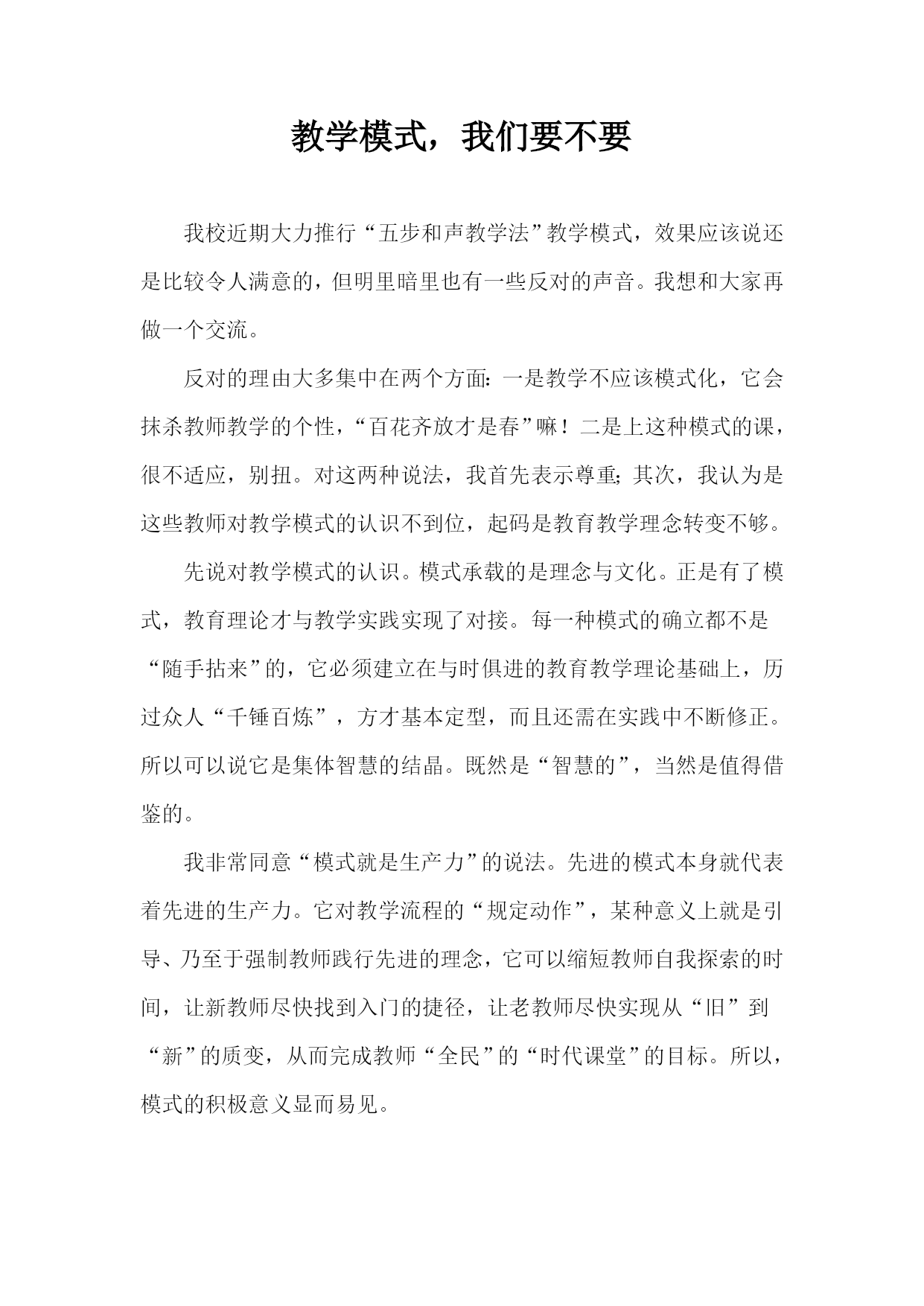 教学模式,我们要不要我校近期大力推行“五步和声教学法”教学模式,效果应该说还是比较令人满意的,但明里暗里也有一些反对的声音。我想和大家再做一个交流。反对的理由大多集中在两个方面:一是教学不应该模式化,它会抹杀教师教学的个性,“百花齐放才是春”嘛!二是上这种模式的课,很不适应,别扭。对这两种说法,我首先表示尊重;其次,我认为是这些教师对教学模式的认识不到位,起码是教育教学理念转变不够。先说对教学模式的认识。模式承载的是理念与文化。正是有了模式,教育理论才与教学实践实现了对接。每一种模式的确立都不是“随手拈来