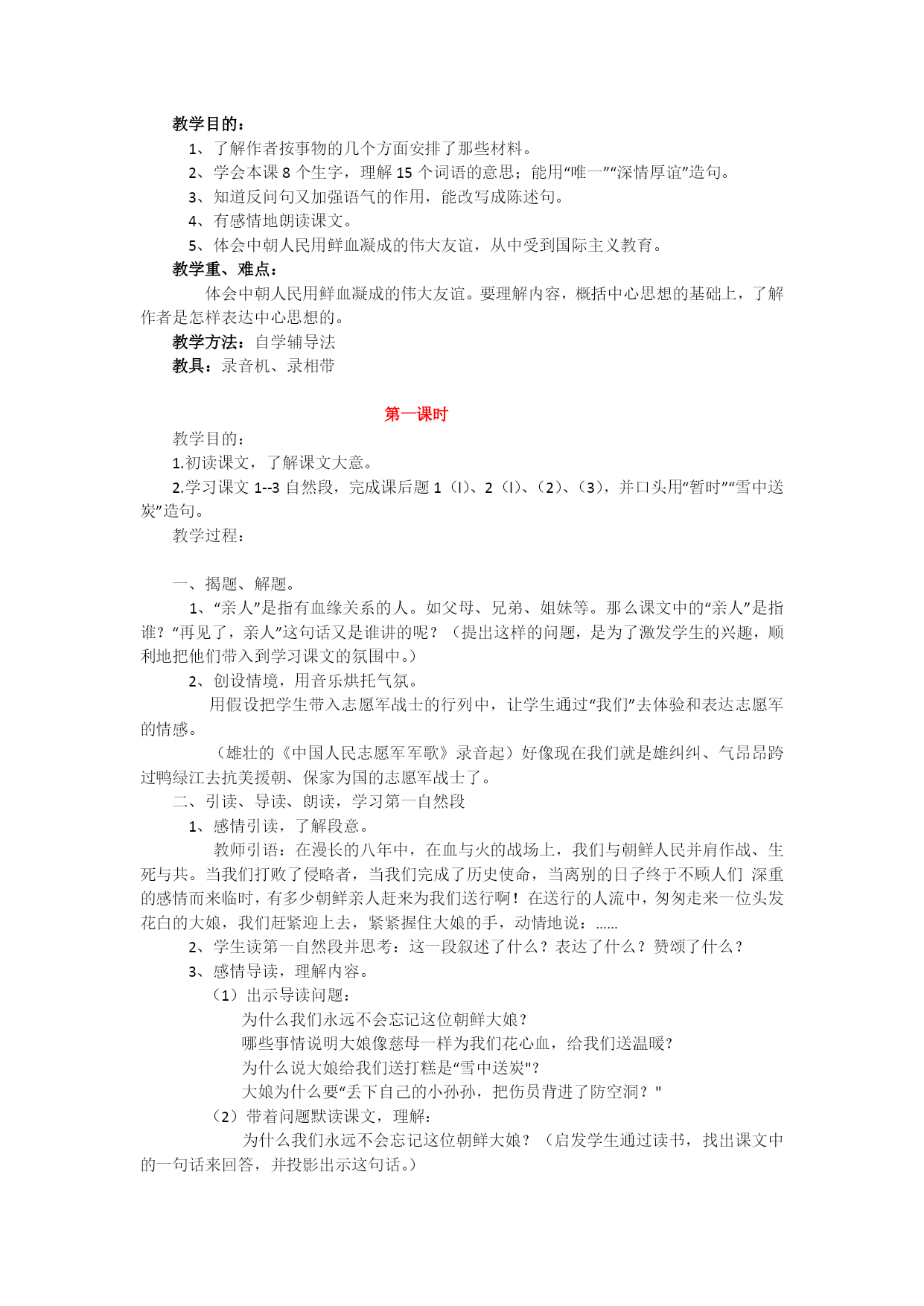 教学目的:1、了解作者按事物的几个方面安排了那些材料。2、学会本课8个生字,理解15个词语的意思;能用“唯一”“深情厚谊”造句。3、知道反问句又加强语气的作用,能改写成陈述句。4、有感情地朗读课文。5、体会中朝人民用鲜血凝成的伟大友谊,从中受到国际主义教育。教学重、难点:体会中朝人民用鲜血凝成的伟大友谊。要理解内容,概括中心思想的基础上,了解作者是怎样表达中心思想的。教学方法:自学辅导法教具:录音机、录相带第一课时教学目的:1.初读课文,了解课文大意。2.学习课文1--3自然段,完成课后题1(l)、2(l