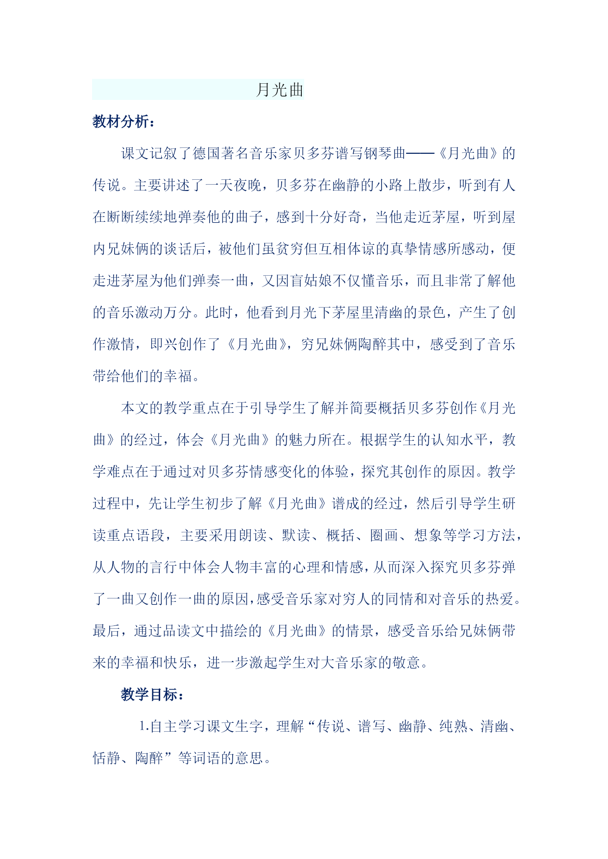 月光曲教材分析:课文记叙了德国著名音乐家贝多芬谱写钢琴曲──《月光曲》的传说。主要讲述了一天夜晚,贝多芬在幽静的小路上散步,听到有人在断断续续地弹奏他的曲子,感到十分好奇,当他走近茅屋,听到屋内兄妹俩的谈话后,被他们虽贫穷但互相体谅的真挚情感所感动,便走进茅屋为他们弹奏一曲,又因盲姑娘不仅懂音乐,而且非常了解他的音乐激动万分。此时,他看到月光下茅屋里清幽的景色,产生了创作激情,即兴创作了《月光曲》,穷兄妹俩陶醉其中,感受到了音乐带给他们的幸福。本文的教学重点在于引导学生了解并简要概括贝多芬创作《月光曲》的