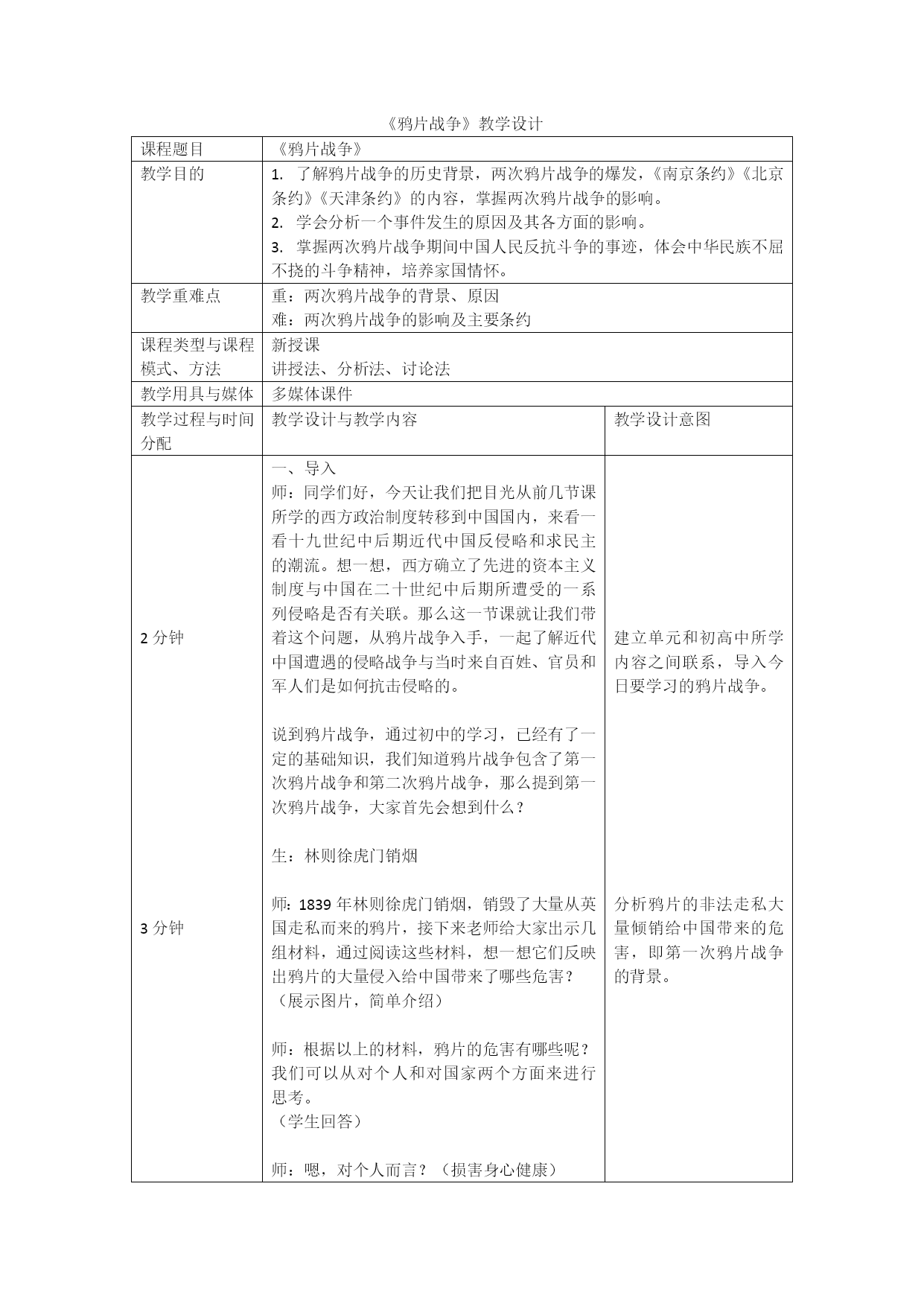 《鸦片战争》教学设计课程题目《鸦片战争》教学目的了解鸦片战争的历史背景,两次鸦片战争的爆发,《南京条约》《北京条约》《天津条约》的内容,掌握两次鸦片战争的影响。学会分析一个事件发生的原因及其各方面的影响。掌握两次鸦片战争期间中国人民反抗斗争的事迹,体会中华民族不屈不挠的斗争精神,培养家国情怀。教学重难点重:两次鸦片战争的背景、原因难:两次鸦片战争的影响及主要条约课程类型与课程模式、方法新授课讲授法、分析法、讨论法教学用具与媒体多媒体课件教学过程与时间分配教学设计与教学内容教学设计意图2分钟3分钟5分钟5分