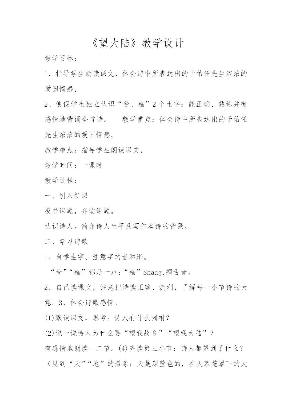 《望大陆》教学设计教学目标:1、指导学生朗读课文,体会诗中所表达出的于佑任先生浓浓的爱国情感。2、使促学生独立认识“兮、殇”2个生字;能正确、熟练并有感情地背诵全首诗。教学重点:体会诗中所表达出的于佑任先生浓浓的爱国情感。教学难点:指导学生朗读课文。教学时间:一课时教学过程:一、引入新课板书课题,齐读课题。认识诗人。简介诗人生平及写作本诗的背景。二、学习诗歌1、自学生字。注意字的音和形。“兮”“殇”都是一声;“殇”Shang,翘舌音。2、自己读课文,注意把诗读正确、流利,了解每一小节诗的大意。3、体会诗歌