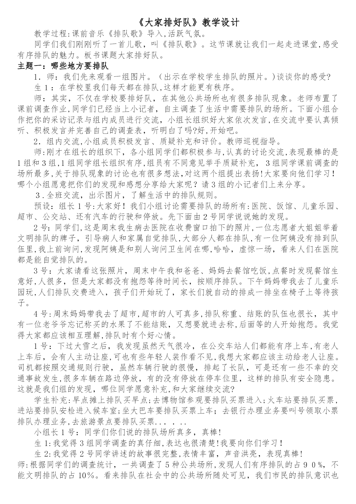 《大家排好队》教学设计教学过程:课前音乐《排队歌》导入,活跃气氛。同学们我们刚刚听了一首儿歌,叫《排队歌》。这节课就让我们一起走进课堂,感受有序排队的魅力。板书课题大家排好队。主题一:哪些地方要排队1.师:我们先来观看一组图片。(出示在学校学生排队的照片。)谈谈你的感受?生1:在学校里我们每天都在排队,这样才能更有秩序。师:其实,不仅在学校要排好队,在其他公共场所也有很多排队现象。老师布置了课前调查作业,同学们已经当上小记者,自主调查了生活中需要排队的场所。下面小组合作把你的采访记录与组内成员进行交流,小