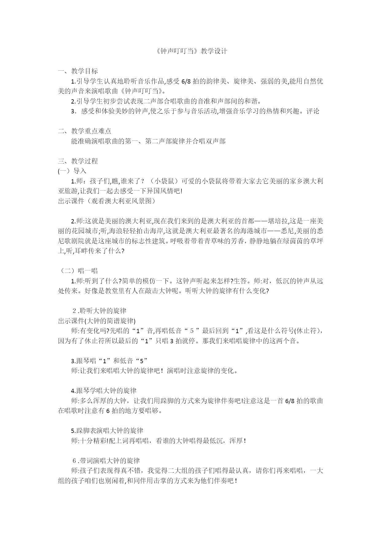 《钟声叮叮当》教学设计一、教学目标1.引导学生认真地聆听音乐作品,感受6/8拍的韵律美、旋律美、强弱的美,能用自然优美的声音来演唱歌曲《钟声叮叮当》。2.引导学生初步尝试表现二声部合唱歌曲的音准和声部间的和谐。3.感受和体验美妙的钟声,使之乐于参与音乐活动,增强音乐学习的热情和兴趣。评论二、教学重点难点能准确演唱歌曲的第一、第二声部旋律并合唱双声部三、教学过程(一)导入1.师:孩子们,瞧,谁来了?(小袋鼠)可爱的小袋鼠将带着大家去它美丽的家乡澳大利亚旅游,让我们一起去感受一下异国风情吧!出示课件(观看澳大